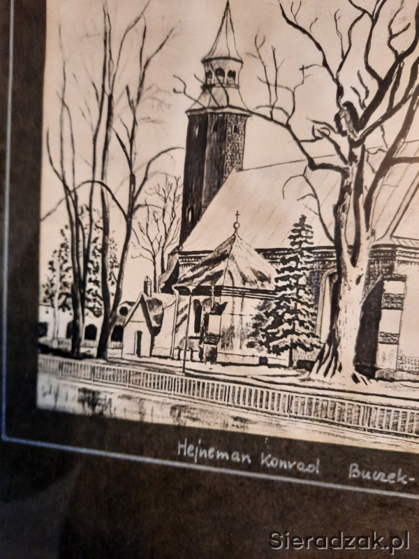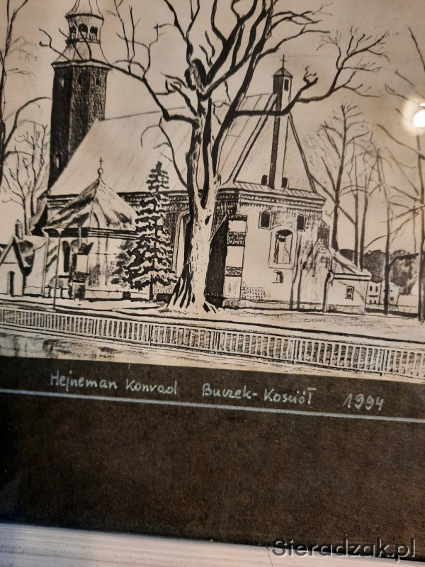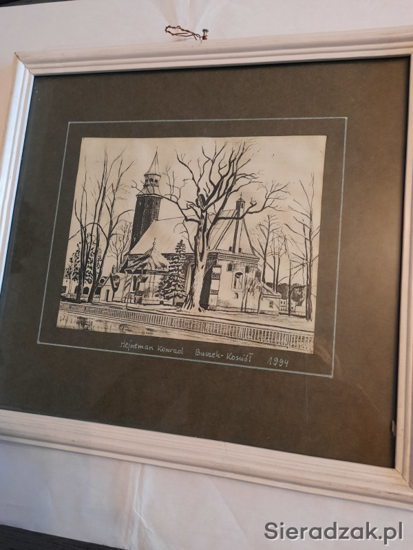 Obraz, akwarela za szkłem w białej ramce. Doskonały widok kościoła w Buczku, pow. łaski.Malował Hejneman Konrad w 1994r.. Wymiary - 33 x 31 cm.