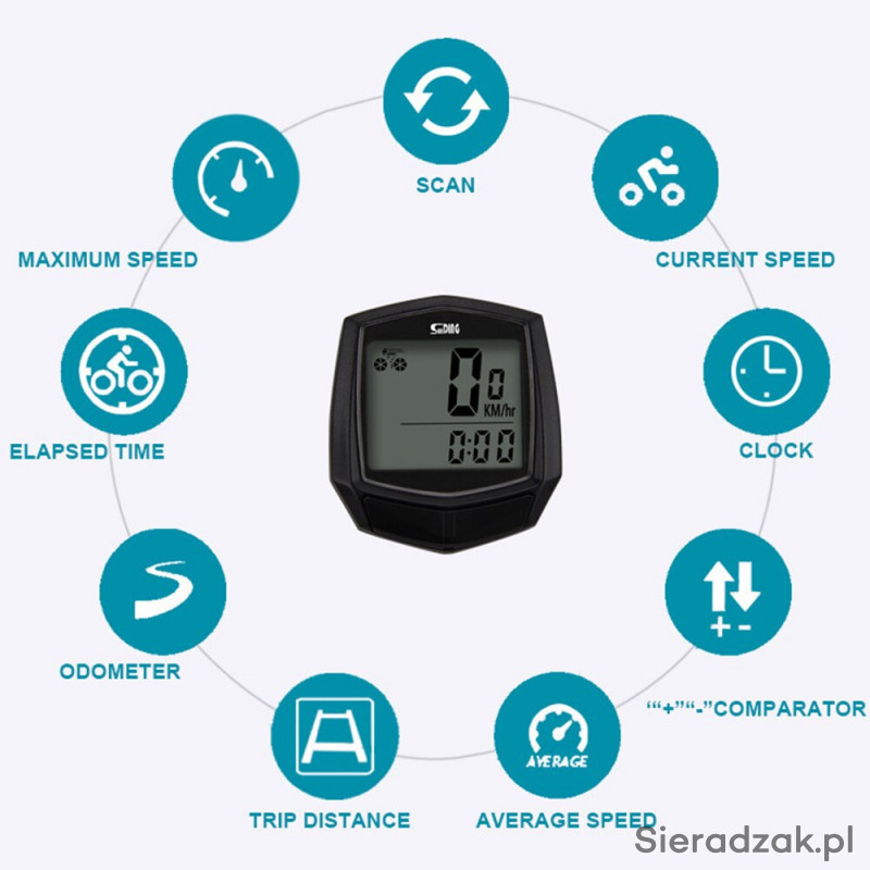 Posiada aż 15 różnych funkcji, które są wyświetlane na bieżąco i zapewniają dużą pomoc podczas jazdy na rowerze, takie jak prędkość, przebyty dystans, czas jazdy, porównanie aktualnej prędkości do średniej, czas wyjazdu, prędkość średnia, stoper, prędkość maksymalna, zegar i wiele innych.