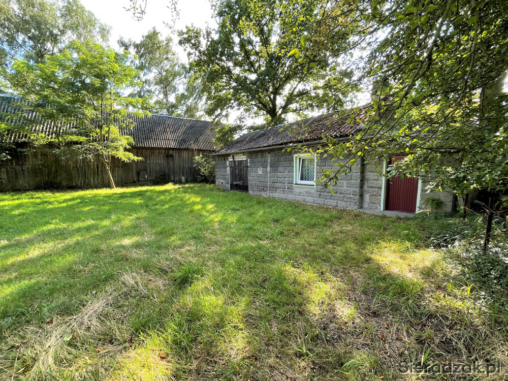 - druga część – zabudowana budynkiem mieszkalnym, murowanym z lat 50-tych, dwuizbowym (pokój, kuchnia) pokrytym dachówką betonową, drewniana stodołą i murowanym budynkiem gospodarczym.