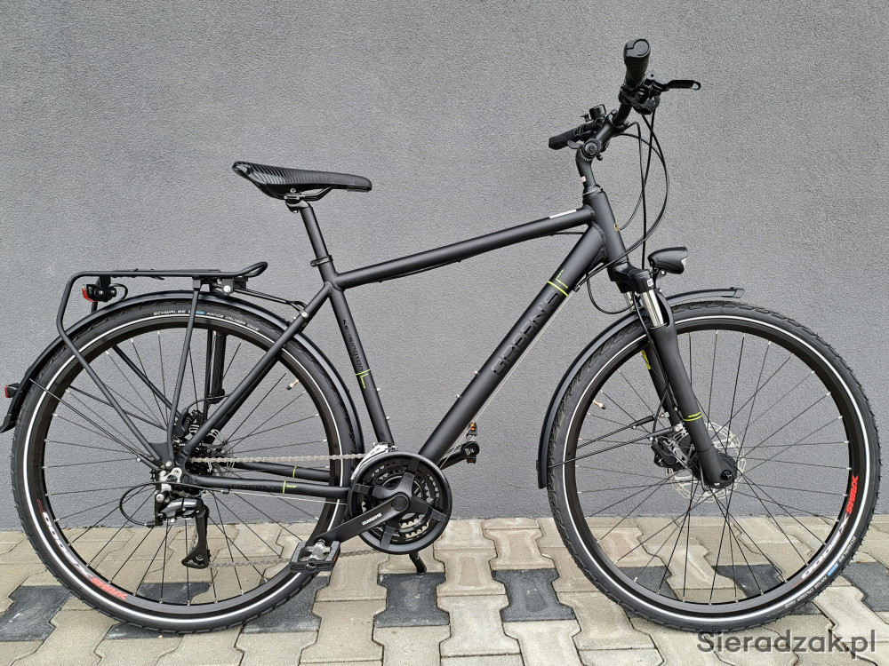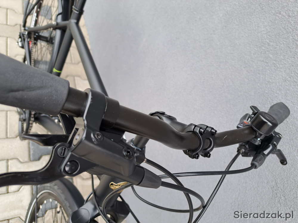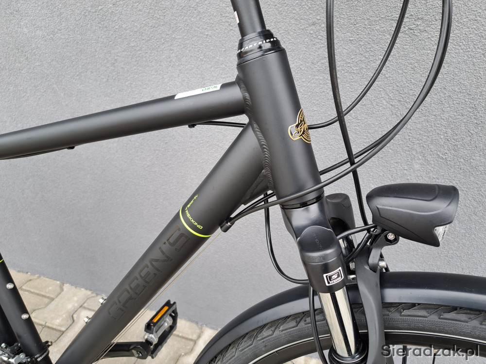 rama aluminium 6061 20" 52cm,napęd 3x8,przerzutka tył shimano acera,przerzutka przód shimano tourney,manetki shimano,hamulce hydrauliczne tarczowe,amortyzator green's sr suntour,dynamo shimano,oświetlenie led axa,opony schwalbe range cruiser,wspornik kierownicy regulowany.na wyposażeniu: pompka,stopka,dzwonek,błotniki,bagażnik,oświetlenie odblaskowe.