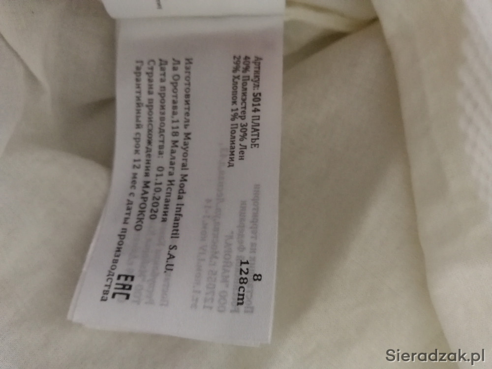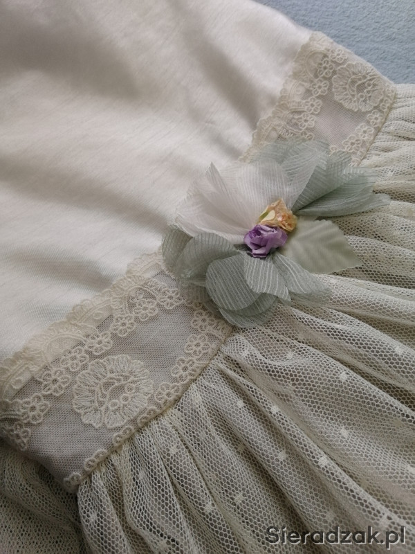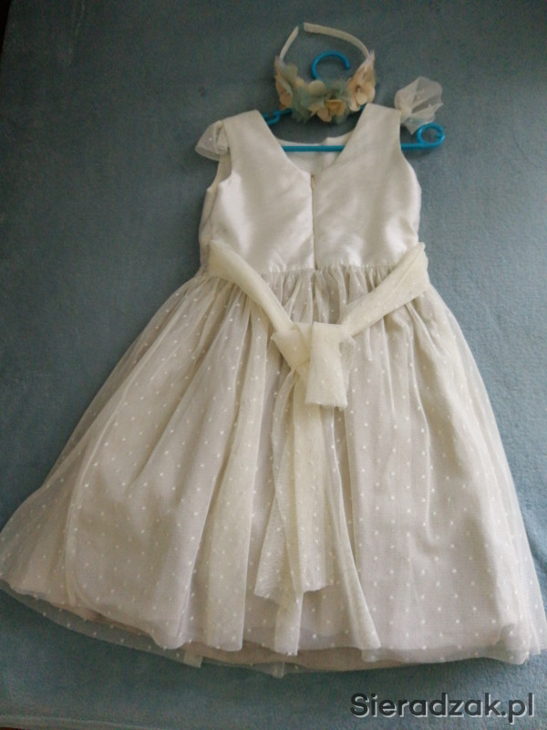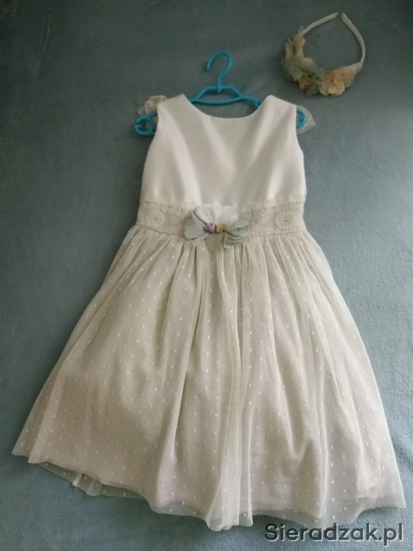 Sprzedam sukienkę firmy Abel and Lula w rozm. 128-idealna na dziewczynki noszące rozmiar 122 szerokość pod pachami mierzona na płasko 30 cm-stan idealny. Założona raz. Sukienka z wszytą halką usztywniającą, wiązana z tyłu. Kwiatek z przodu można odpiąć. Do sukienki dokładam opaskę firmy Mayoral, dopasowana do sukienki. Istnieje możliwość dokupienia do sukienki turkusowego sweterka z brokatowa nitka.