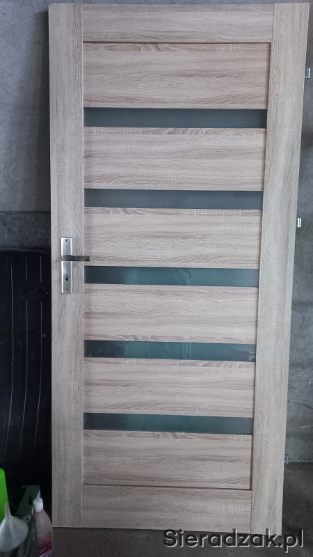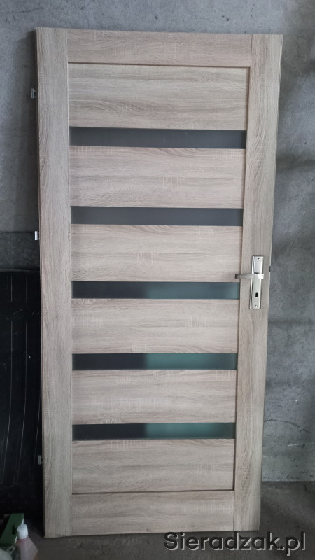 Nowe drzwi w kolorze dąb sonoma bez ościeżnicy z klamką. Szerokość - 90cm