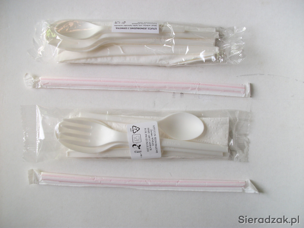 Oferuję sztućce plastikowe (białe i przezroczyste) + Kubek papierowy. Sztućce wykonane są z grubej warstwy tworzywa, dzięki czemu są sztywne i wytrzymałe.