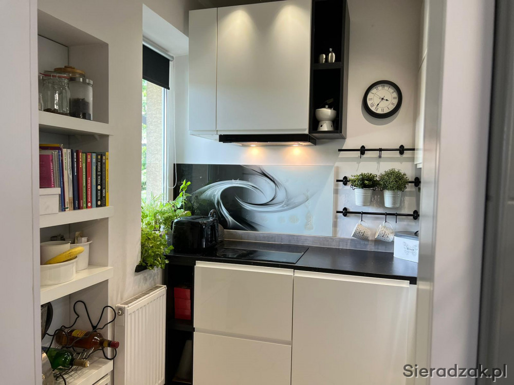 Kuchnia - w pełni wyposażona w wysokiej jakości sprzęt AGD ( płyta elektryczna, okap,piekarnik,lodówko – chłodziarka) otwarta na jadalnię i salon.