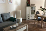 Mieszkanie składa się z salonu połączonego z aneksem kuchennym, sypialni, drugiego pokoju, przedpokoju oraz łazienki (w sumie 68 m2). Jest w pełni umeblowane w wysokim standardzie oraz wyposażone (piekarnik, lodówka, zmywarka, płyta indukcyjna, pralka)