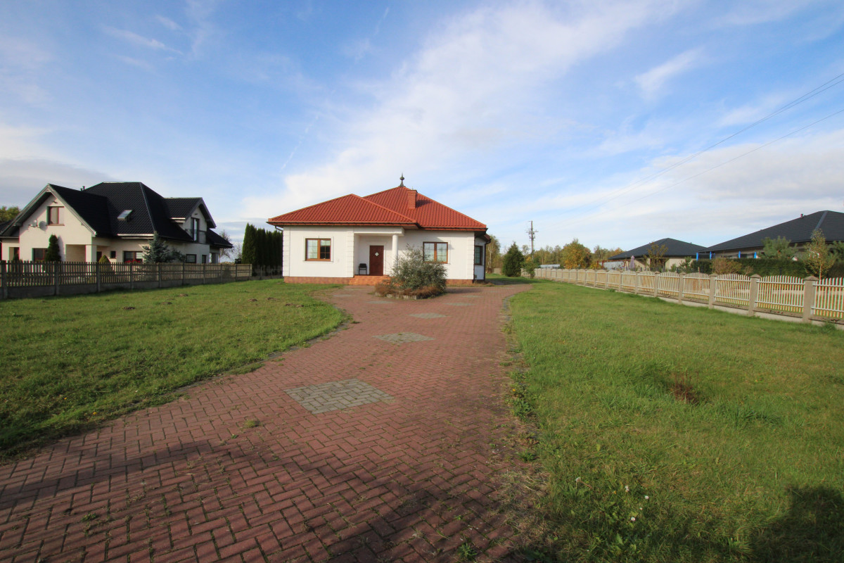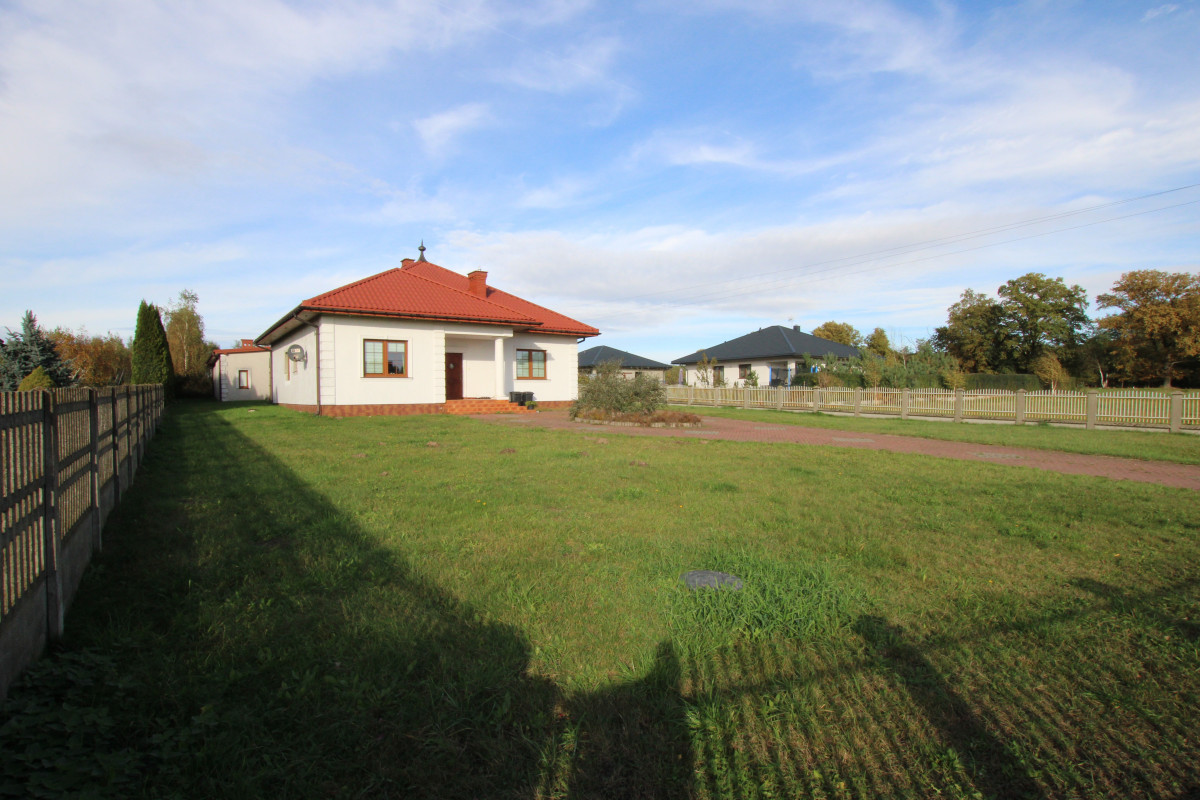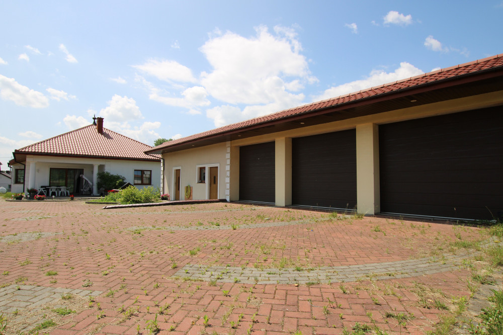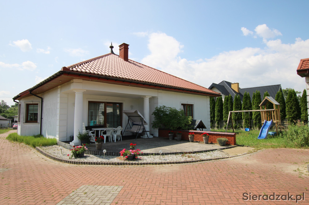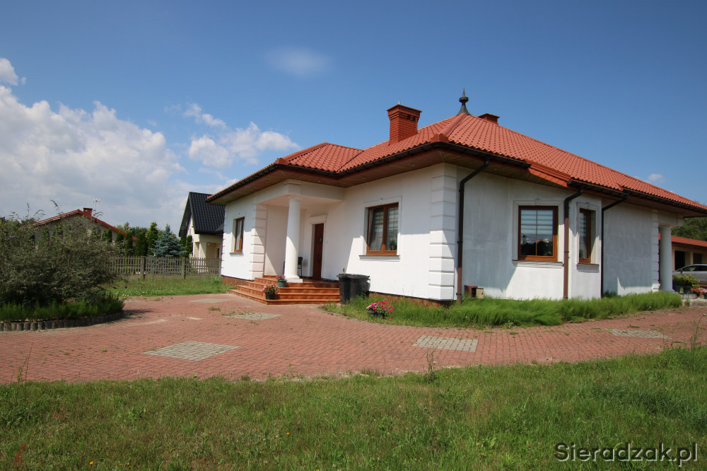 Sieradzkie Biuro Nieruchomości oferuje na sprzedaż dom z 2008 roku o powierzchni użytkowej 125,6 m2, budynek garażowy około 150 m2 w skład którego wchodzą 3 duże garaże ze zautomatyzowanymi drzwiami, magazyn oraz letnia kuchnia urządzona ze spiżarnią i wc.