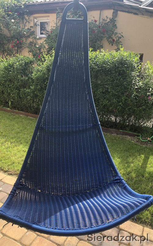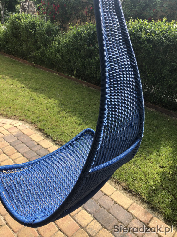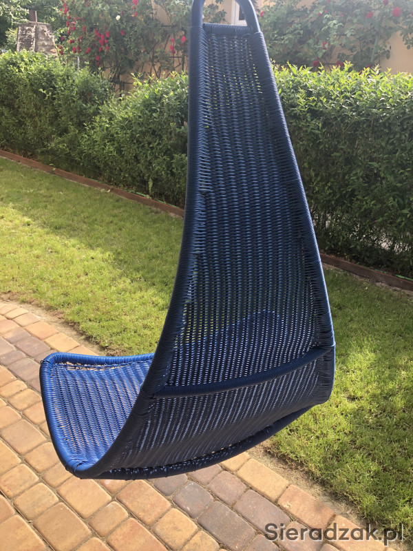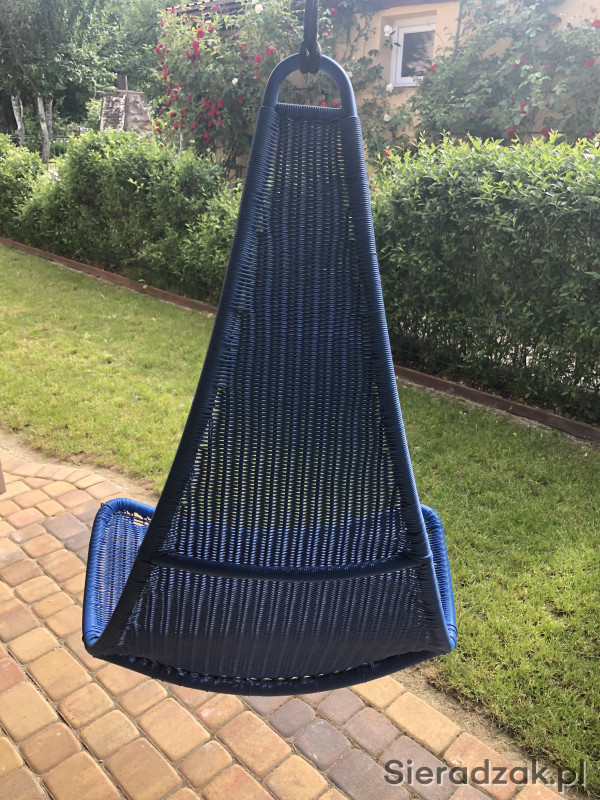 kokon,wiszący fotel Svinga Ikea.Huśtawka-fotel/rodzaj hamaka ale"siedzącego"/ to świetna zabawa dla dorosłych i dzieci na świeżym powietrzu.Fotel jest plecionką włókna sztucznego koloru niebieskiego,oplot wykonany na metalowych rurkach stanowiących jedynie osnowę-brzegi fotela.U góry fotel posiada tzw.ucho do zawieszenia fotela z zamocowaną do niego mocną liną ułatwiającą zawieszenie np.w ogrodzie na gałęzi drzewa lub stojaku do huśtawek.Używany w dobrym stanie, nie zniszczony