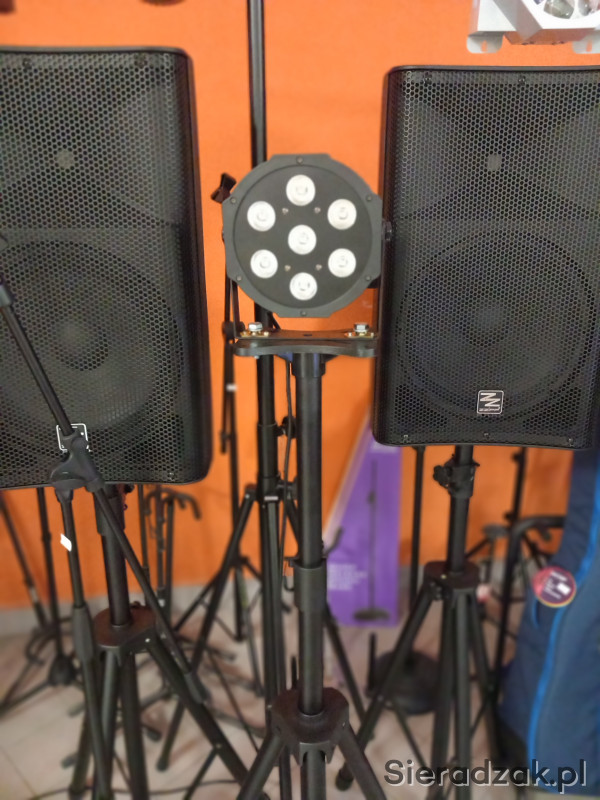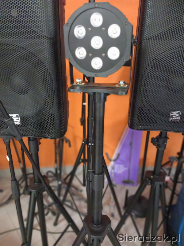 Dostępne też inne reflektory par led, listwy bar, głowy ruchome, stroboskopy, wytwornice dymu i baniek, statywy oświetleniowe.