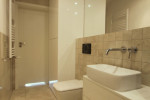 Łazienka z WC wyposażona w pralkę, szafki z mdf lakierowanego na biało oraz zabudowę z panelem prysznicowym.
