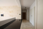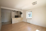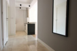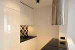 W pokoju dziennym wydzielono aneks kuchenny zaaranżowany zabudową mebli z lakierowanego na biało mdf, wyposażoną we wszystkie niezbędne sprzęty AGD (lodówka, płyta indukcyjna, piekarnik, zmywarka, pochłaniacz).