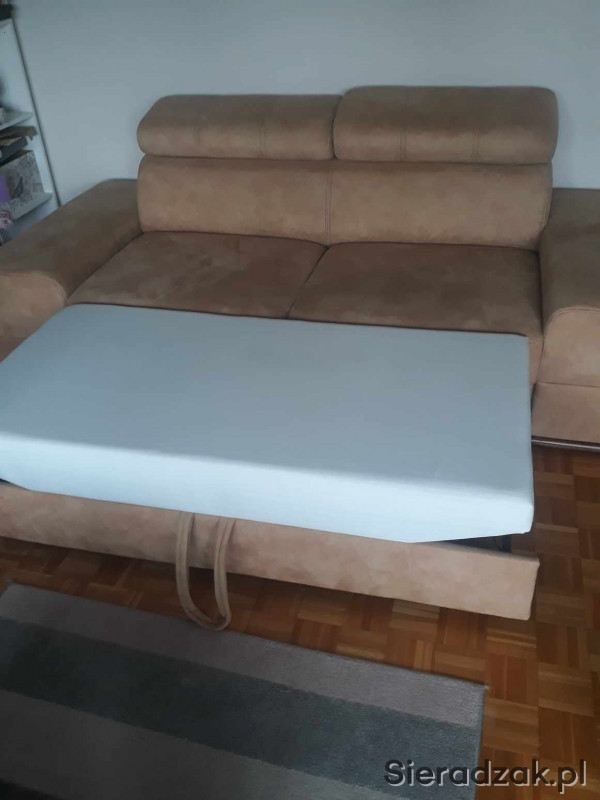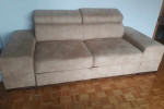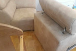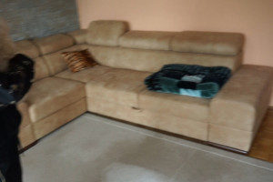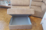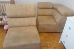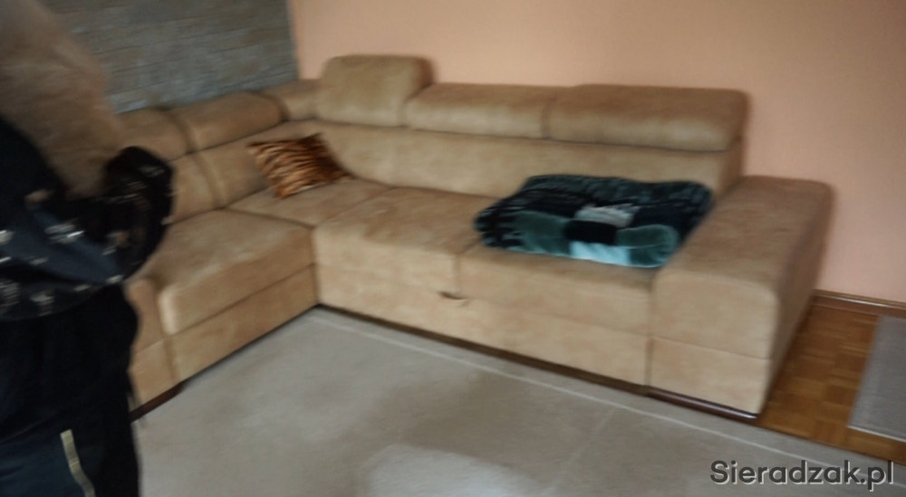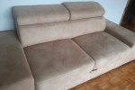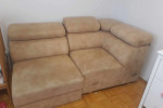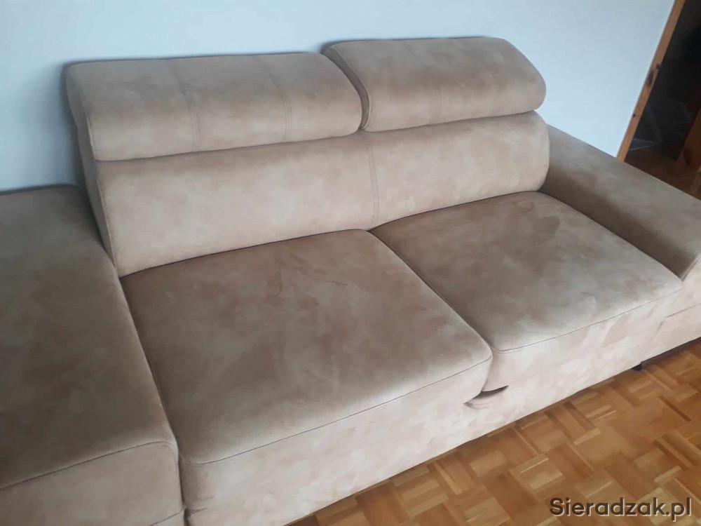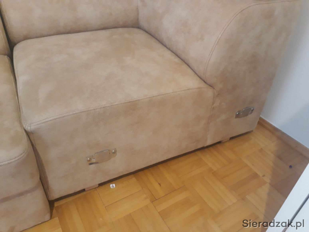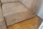 Narożnik w super stanie, właściwie nieużywany. Materiał obiciowy nubuk/zamsz. Kolor jak widać - ciemniejszy beż. Posiada wysuwany materac (nieużywany), schowek w jednym module oraz regulowane zagłówki. Aktualnie jest rozłożony na kilka elementów. Można z niego zrobić sofę, a 2 pozostałe elementy wykorzystać w innym pomieszczeniu. Elementy naroznikowe moga być zamontowane po obu stronach. Kanapa ma tez ładnie obity tył.