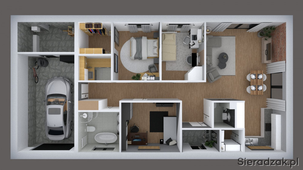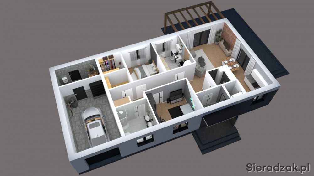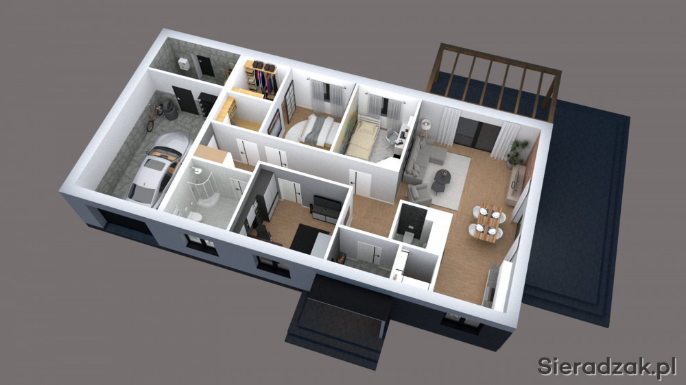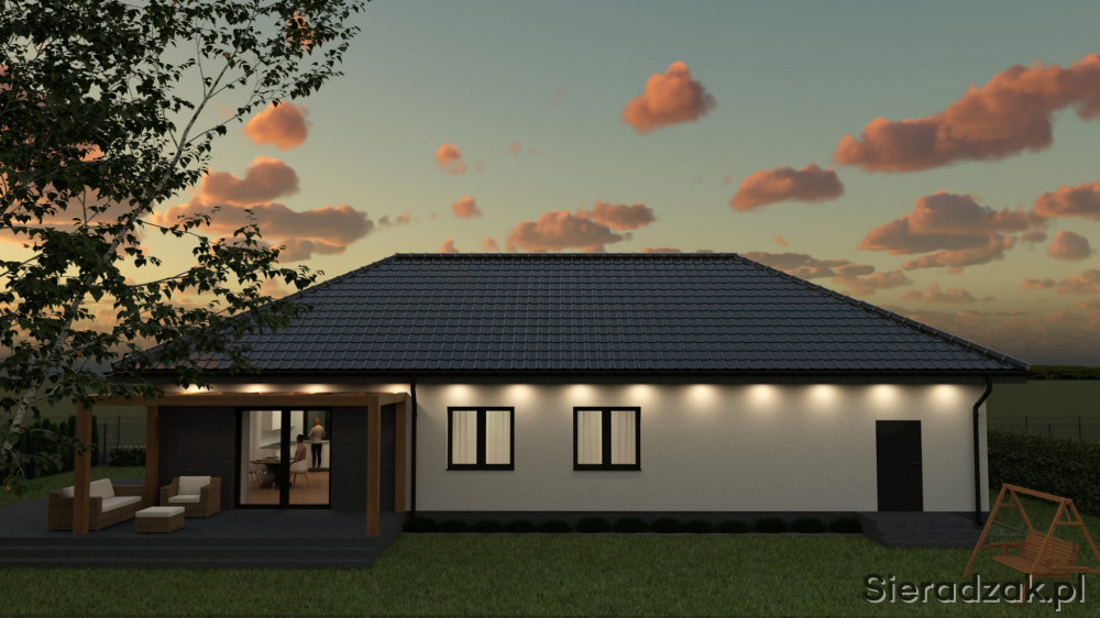 Pozostała część domu to już strefa prywatna z trzema sypialniami, garderobą, łazienką oraz pralnią. W bryle budynku znajduje się również garaż oraz pomieszczenie gospodarcze.