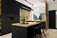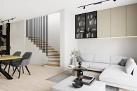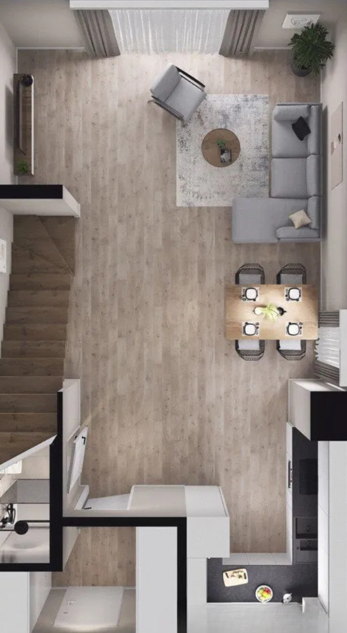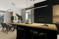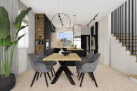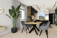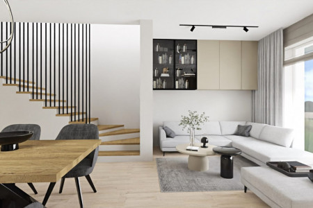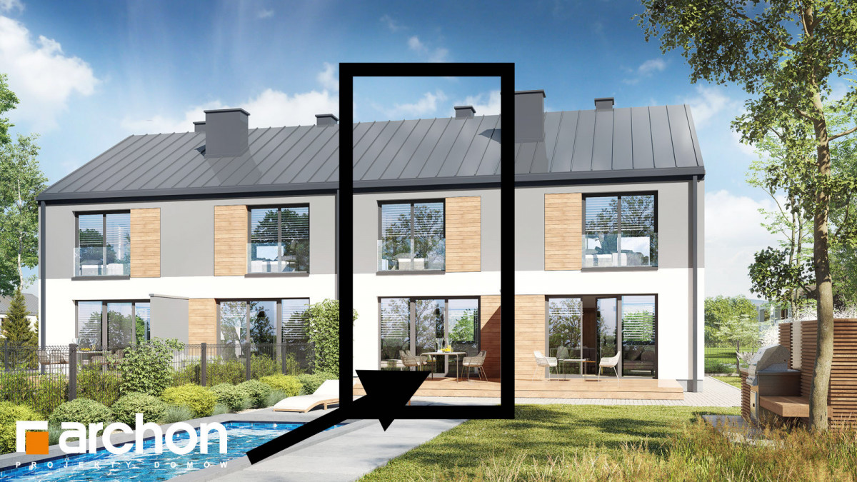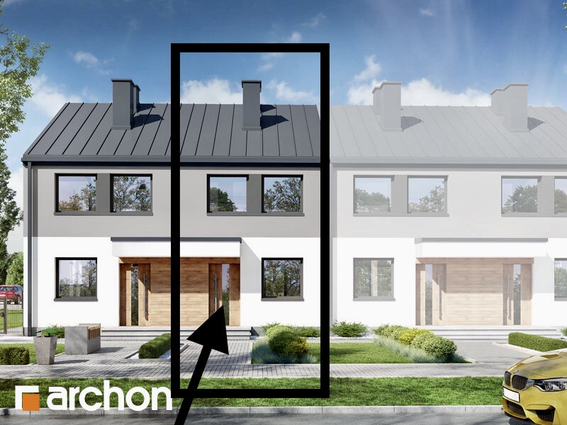 Zamieszczone wizualizacje przedstawiają przykładową aranżację parteru apartamentu oraz elewacji frontowej i tarasowej budynku( okno na taras hst oraz 2 okna na piętrze w projekcie).