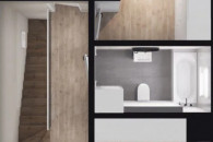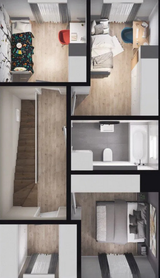 Piętro (46,1 mkw): korytarz i klatka schodowa- 9,5mkw, garderoba – 4,2, pokój 1- 9,8mkw, łazienka- 4,7mkw, pokój 2-10,5 mkw, pokój 3- 7,4mkw