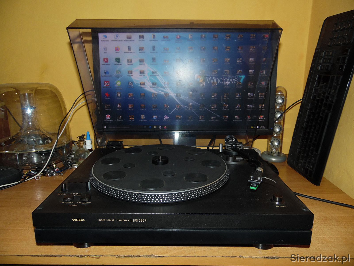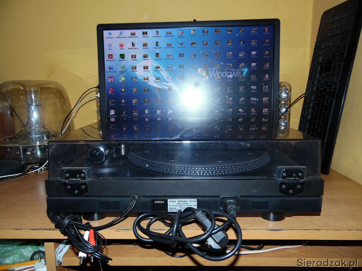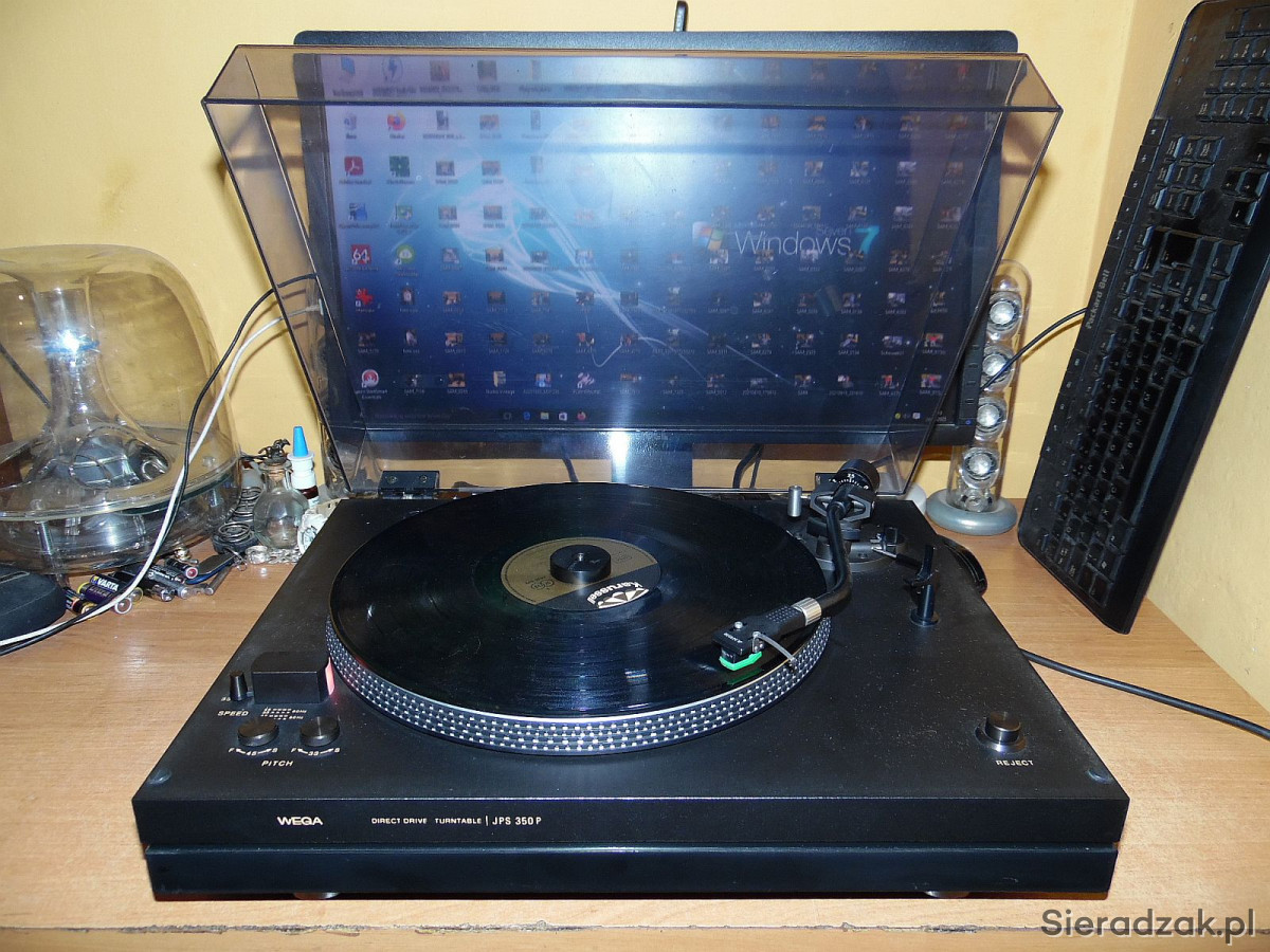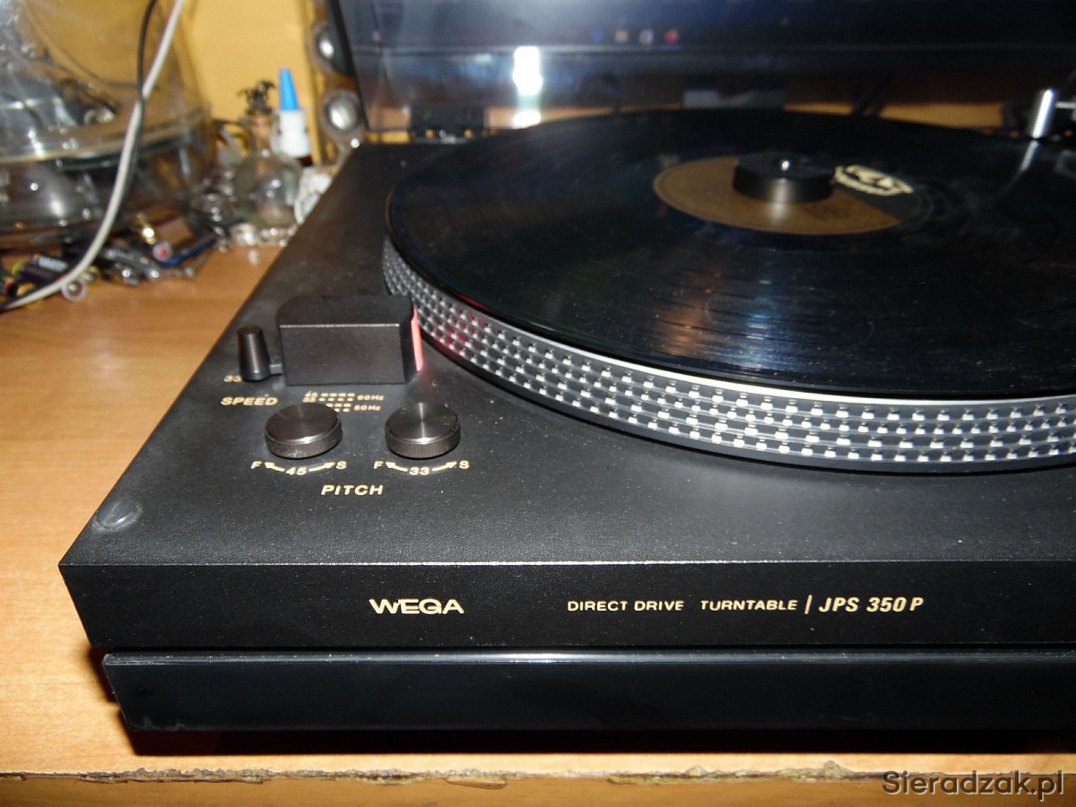 WEGA model JPS 350P. Gramofon jest to produkcji SONY czyli SONY PS 3300. Solidny, ciężki w drewnie o napędzie bezpośrednim, półautomatyczny gramofon ( ramie ustawiamy manualnie w dowolne miejsce na płycie natomiast samoczynnie powraca na swoje miejsce po zakończeniu strony płyty lub po naciśnięciu REJECT ). Na pokładzie antyscating, tradycyjnie dwie prędkości obrotowe 33 i 45 rpm. płynnie regulowane oraz stroboskop . Na uwagę zasługuje ramie typu S precyzyjnie ułożyskowane jak i ciężki solidny aluminiowy talerz. Przewód zasilający, sygnałowy i uziemiający w komplecie. Wkładka oryginalna SONY z oryginalną igłą w stanie co najmniej dobrym gra znakomicie.