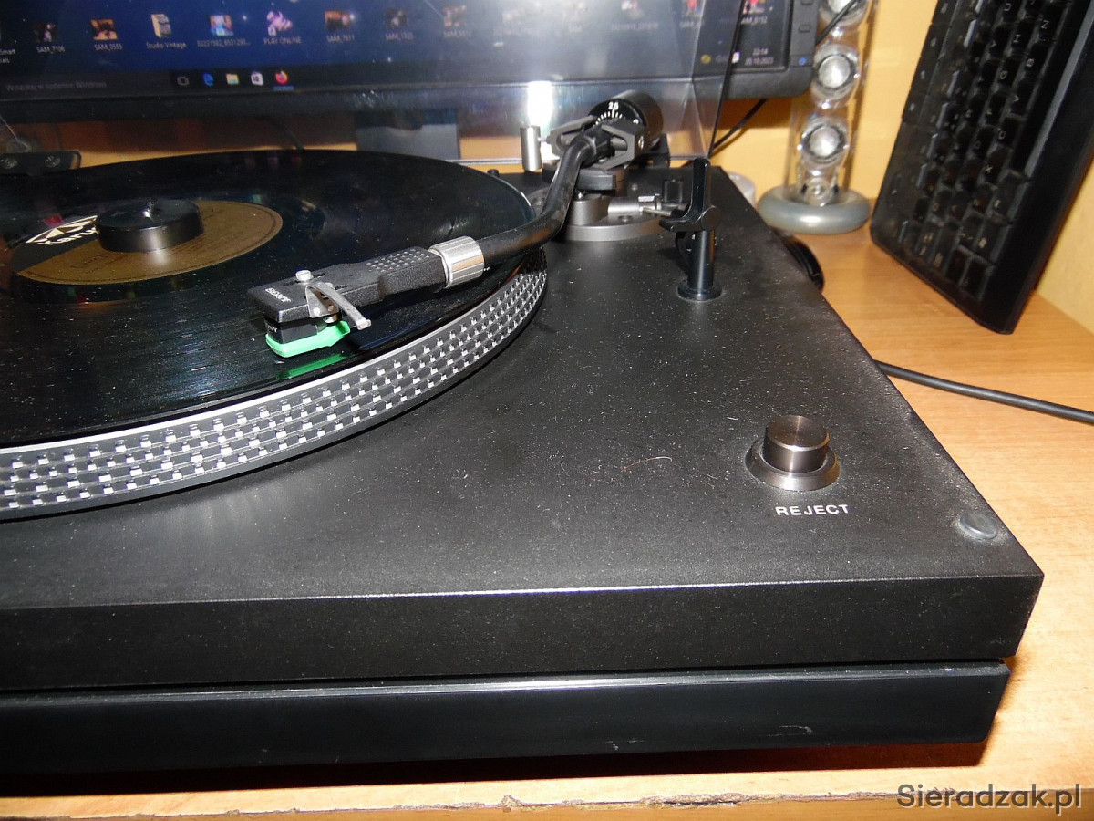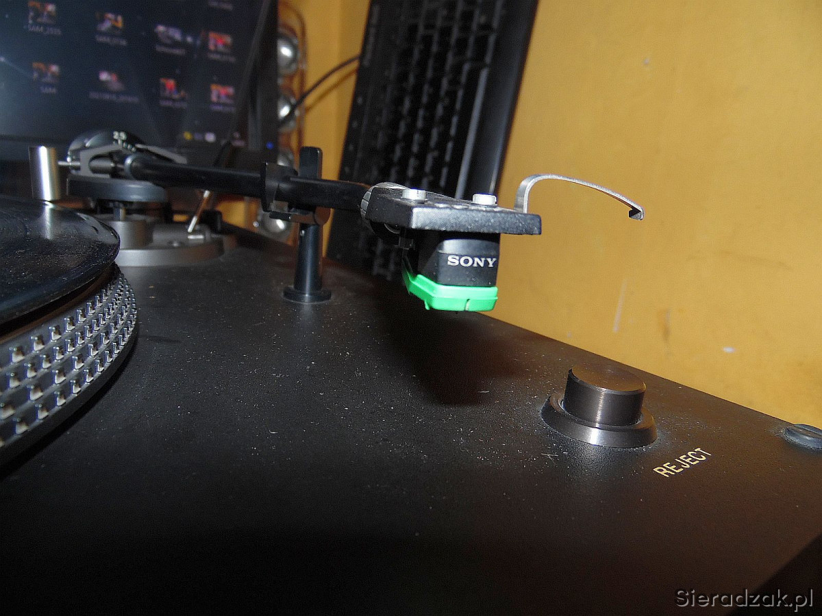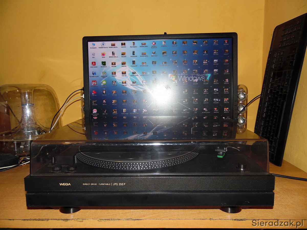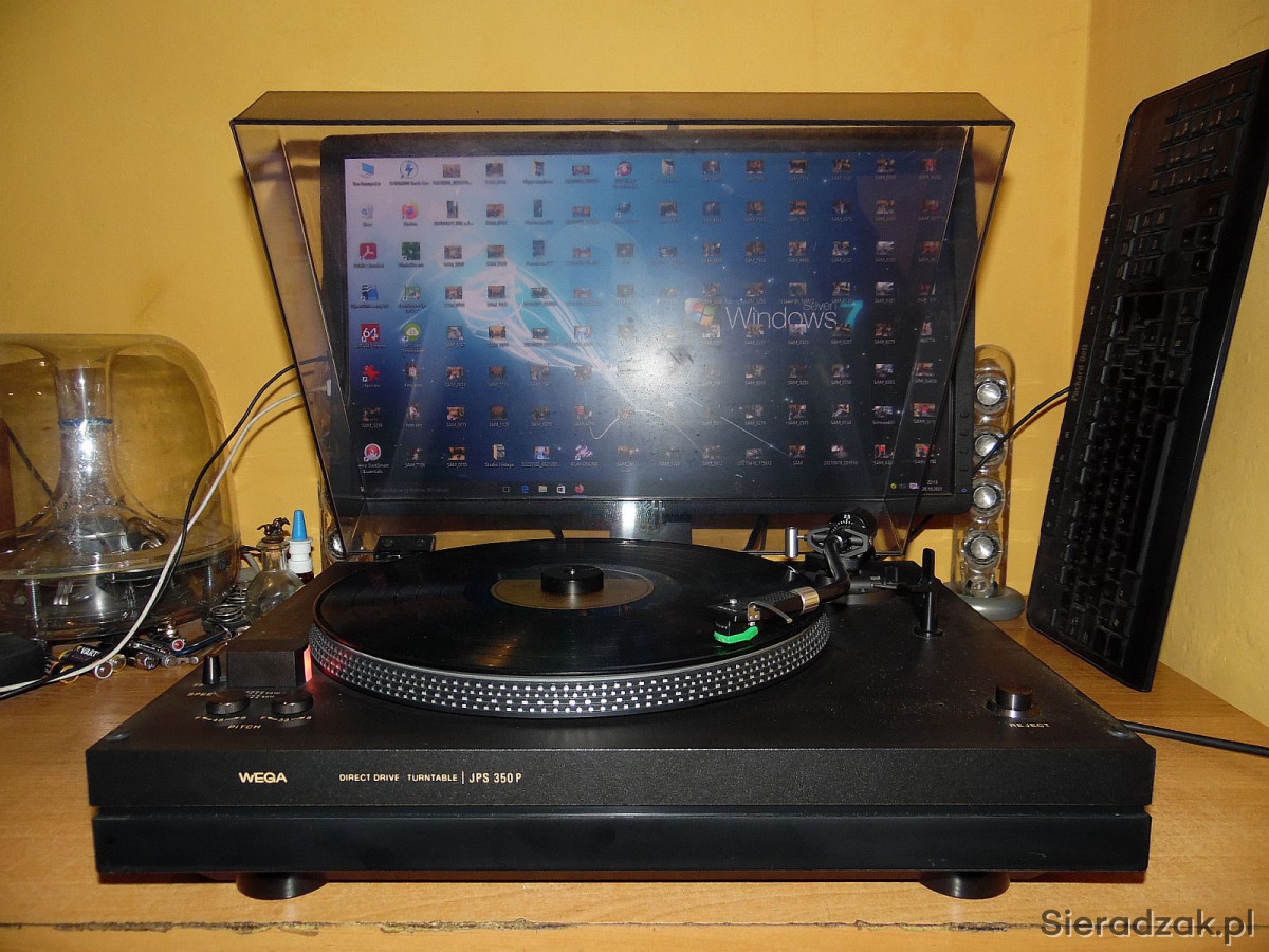 WEGA model JPS 350P. Gramofon jest to produkcji SONY czyli SONY PS 3300. Solidny, ciężki w drewnie o napędzie bezpośrednim, półautomatyczny gramofon ( ramie ustawiamy manualnie w dowolne miejsce na płycie natomiast samoczynnie powraca na swoje miejsce po zakończeniu strony płyty lub po naciśnięciu REJECT ). Na pokładzie antyscating, tradycyjnie dwie prędkości obrotowe 33 i 45 rpm. płynnie regulowane oraz stroboskop . Na uwagę zasługuje ramie typu S precyzyjnie ułożyskowane jak i ciężki solidny aluminiowy talerz. Przewód zasilający, sygnałowy i uziemiający w komplecie. Wkładka oryginalna SONY z oryginalną igłą w stanie co najmniej dobrym gra znakomicie.