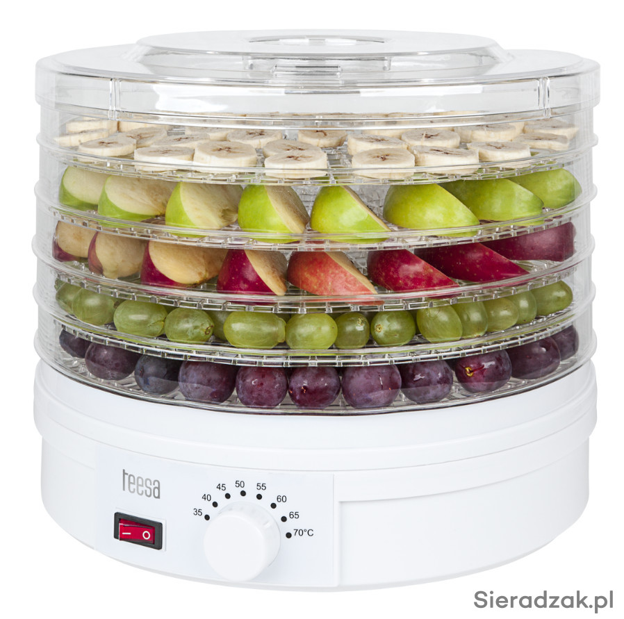 Suszarka TSA3030 została wyposażona w pięć sit o średnicy 32 cm, które pozwolą na suszenie nawet 5 kilogramów żywności. Teraz, niezależnie od pory roku, możesz cieszyć się dawką naturalnych witamin lub zaskoczyć znajomych zdrową przekąską podczas wspólnych spotkań.