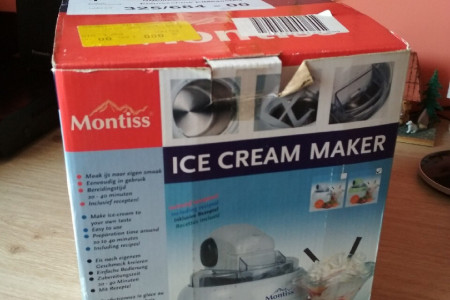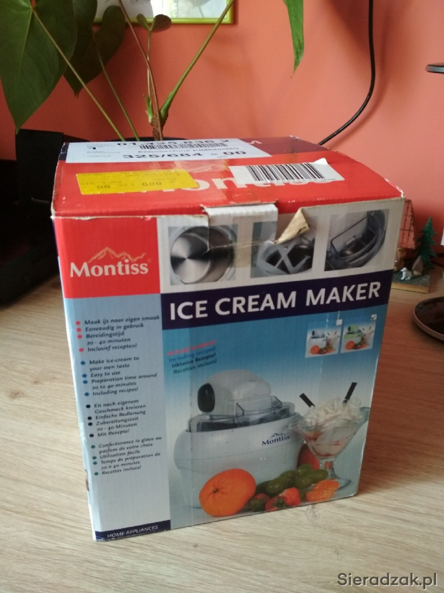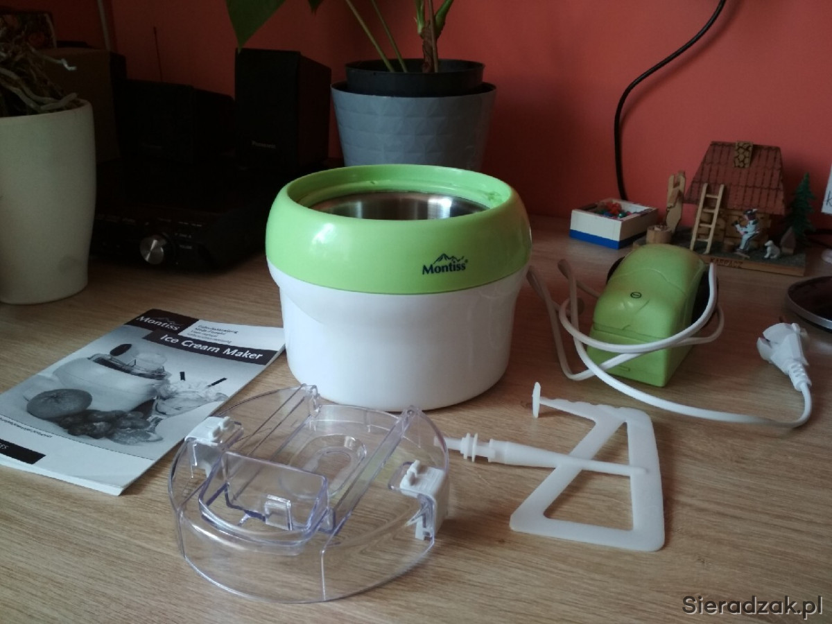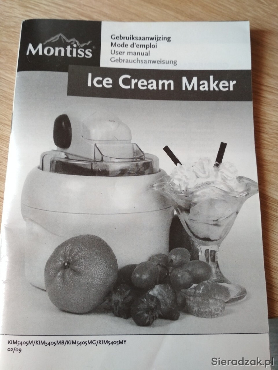 Maszyna do lodów marki niderlandzkiej Montiss, nr KIM5405MG. Sprzęt w pełni sprawny, użyty raptem kilka razy parę miesięcy temu. Instrukcja w językach niderlandzkim, francuskim, niemieckim i angielskim; po polsku dostępna za darmo w internecie. Sprzęt prosty w montażu, demontażu, jak i w użyciu. Zawiera przepisy w językach obcych.