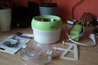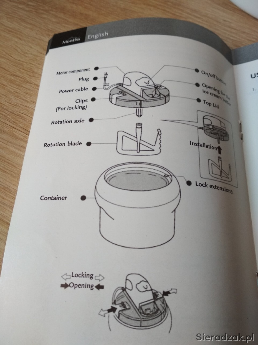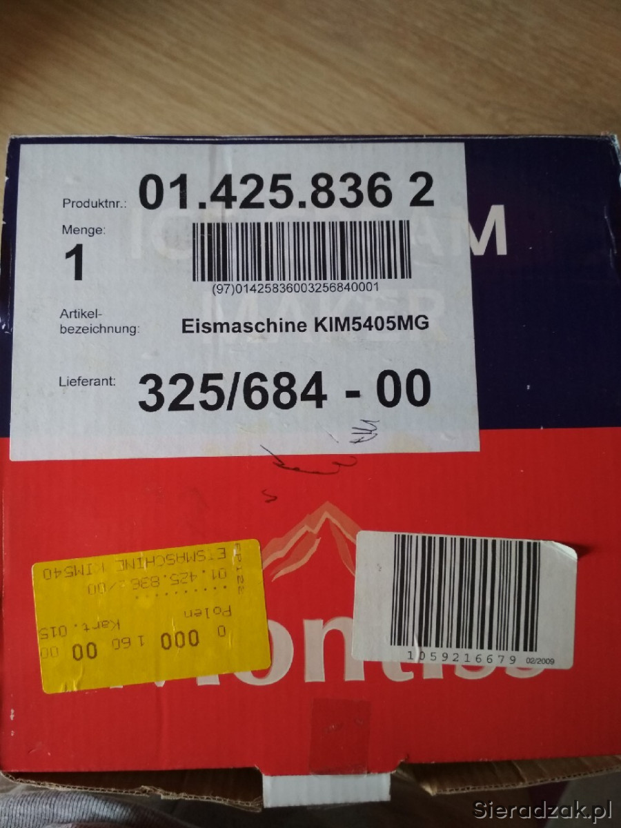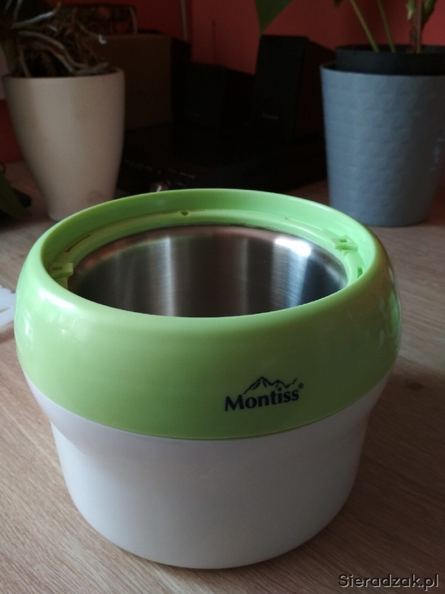 Maszyna do lodów marki niderlandzkiej Montiss, nr KIM5405MG. Sprzęt w pełni sprawny, użyty raptem kilka razy parę miesięcy temu. Instrukcja w językach niderlandzkim, francuskim, niemieckim i angielskim; po polsku dostępna za darmo w internecie. Sprzęt prosty w montażu, demontażu, jak i w użyciu. Zawiera przepisy w językach obcych.