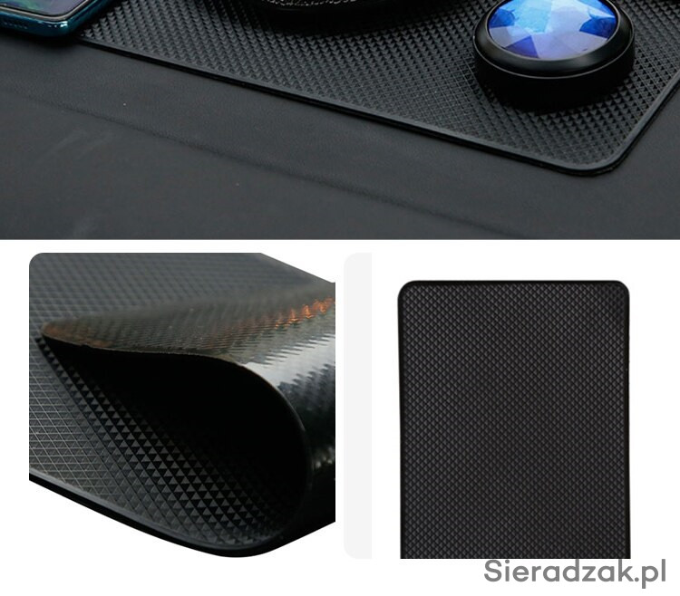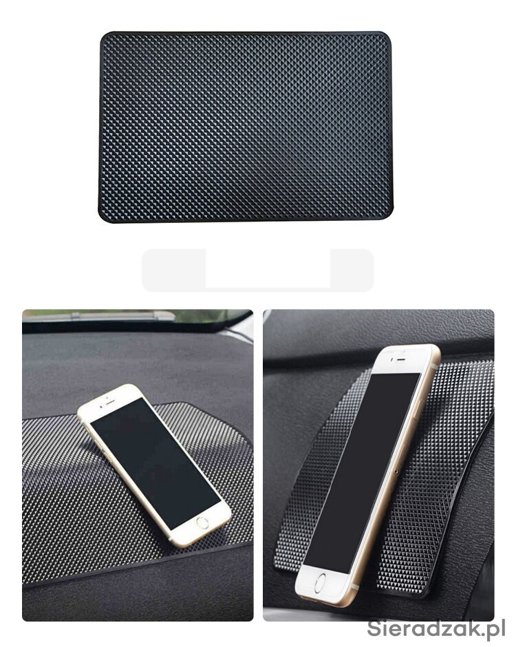Lepka powierzchnia od spodu maty zapewnia, że pozostaje na miejscu, nawet na gładkich powierzchniach, takich jak deska rozdzielcza samochodu.