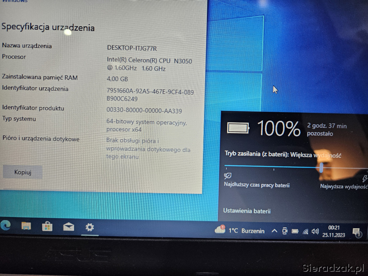 Specyfikacja na jednym ze zdjęć, laptop działa sprawnie ale można go znacznie przyśpieszyć zakładając dysk SSD, mogę to zrobić za dopłatą 100 złotych.