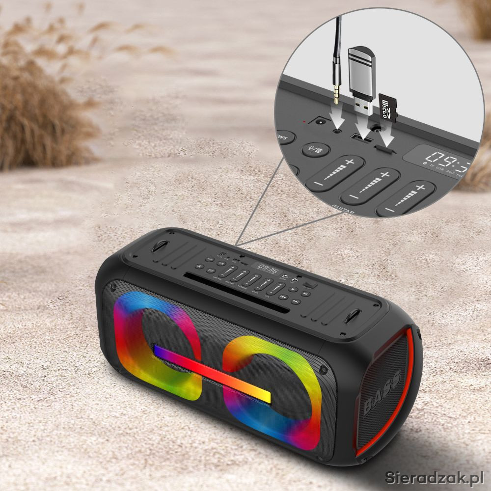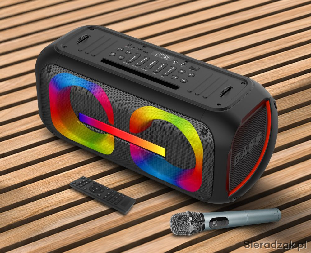 PRZENOŚNY ZESTAW NAGŁOŚNIENIOWY Z MIKROFONEM BEZPRZEWODOWYM DO RĘKI I PODŚWIETLENIEM LED.