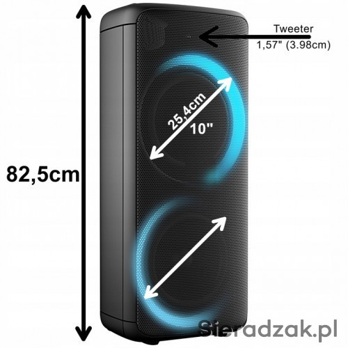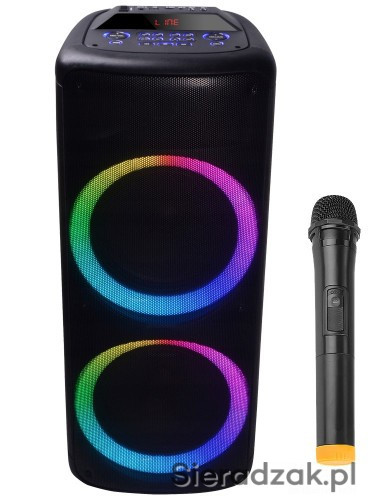 DUŻY PRZENOŚNY ZESTAW NAGŁOŚNIENIOWY Z MIKROFONEM BEZPRZEWODOWYM DO RĘKI I PODŚWIETLENIEM LED.