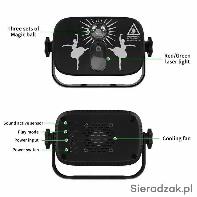 Efekt ze strumieniami kolorów RGB MIX i laserem red i grenn wzory. Dzięki temu posiada duże możliwości pracy w każdych warunkach. Każdy użytkownik będzie z pewnością zadowolony mając możliwość użycia wszystkich efektów na każdej imprezie.