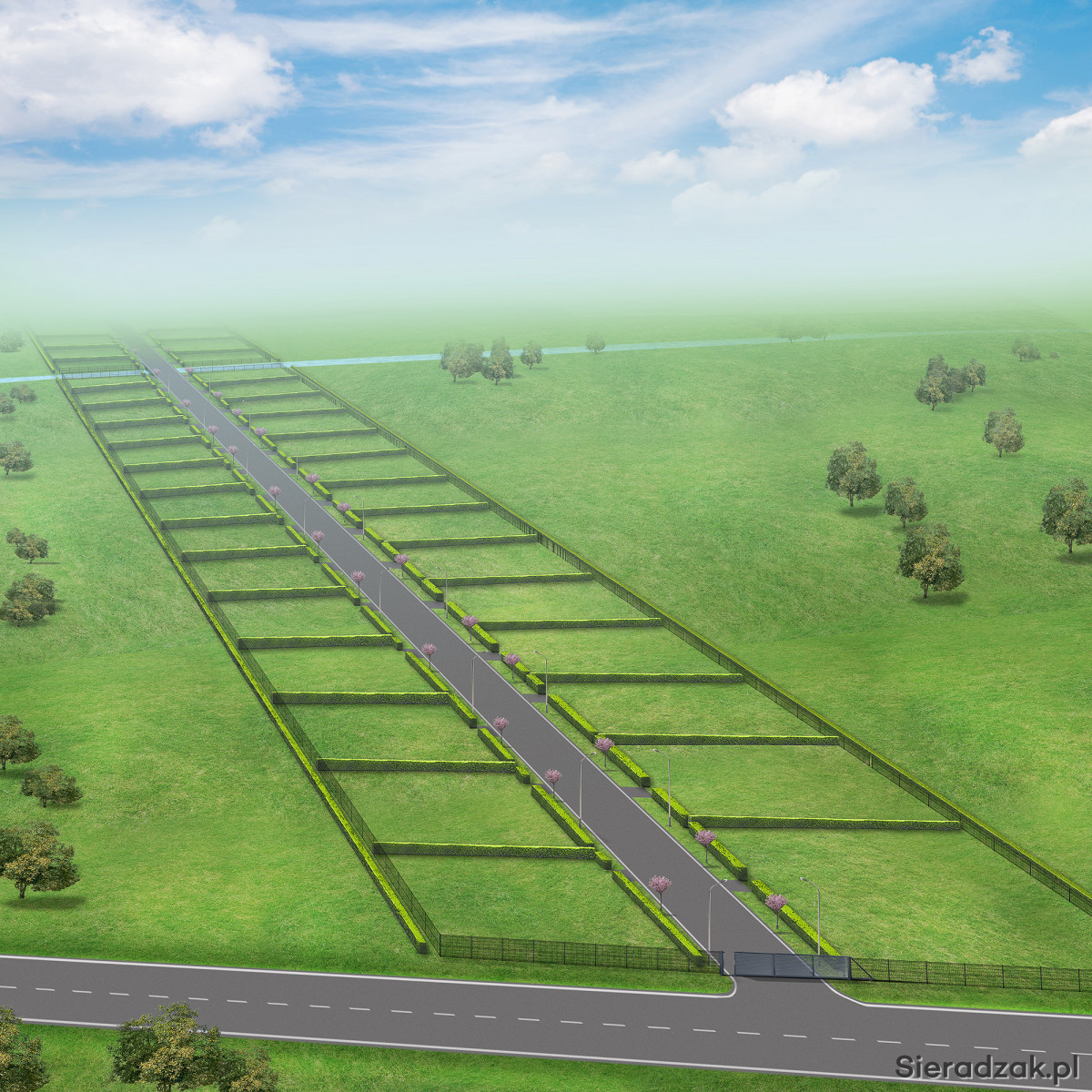 Osiedle Wiśniowe składa się z 37 działek i zlokalizowane jest przy ulicy Sieradzkiej, co zapewnia wygodny dojazd do centrum miasta w tym do instytucji publicznych oraz sklepów.