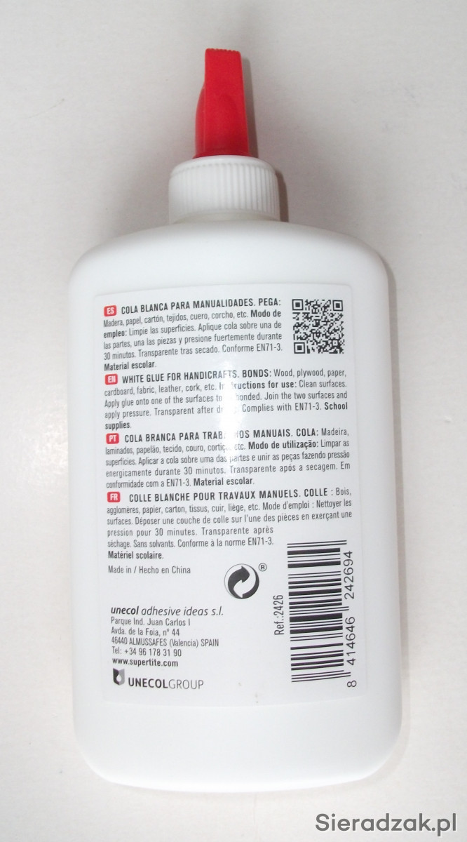 Sprzedam klej produkcji Hiszpańskiej do drewna, papieru, tkanin, skóry i przedmiotów drewnopochodnych. Klejone powierzchnie są nie do rozerwania. Czerwona nakrętka jednocześnie jest dozownikiem. Klej jest biały, a po wyschnięciu przezroczysty.