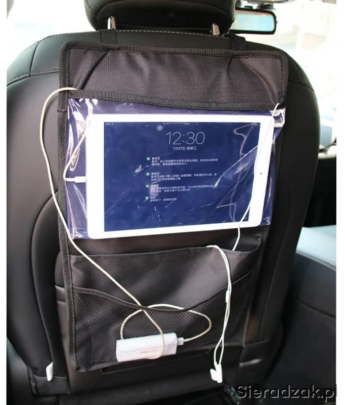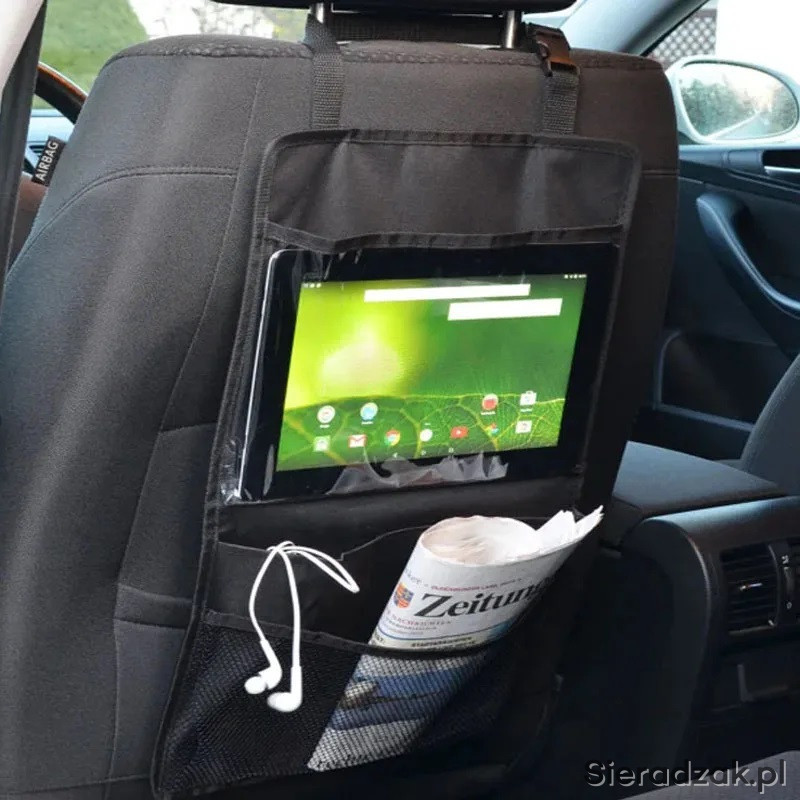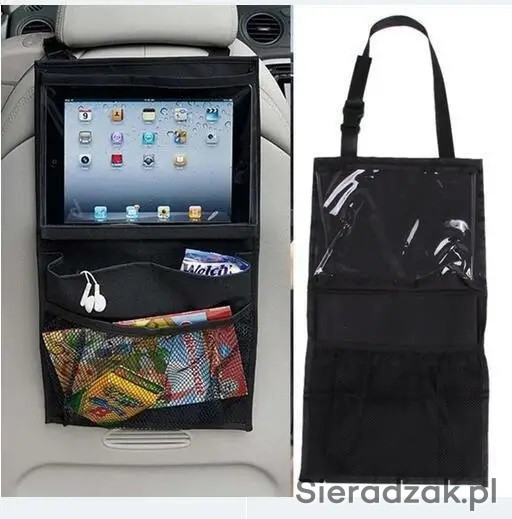 Oferuję prosty bez wodotrysków organizer na plecy fotela samochodu. Posiada 3 kieszenie. Najważniejsza z nich to przezroczysta kieszeń będąca ekranem dotykowym może zmieścić tablet do 10,5 cala.