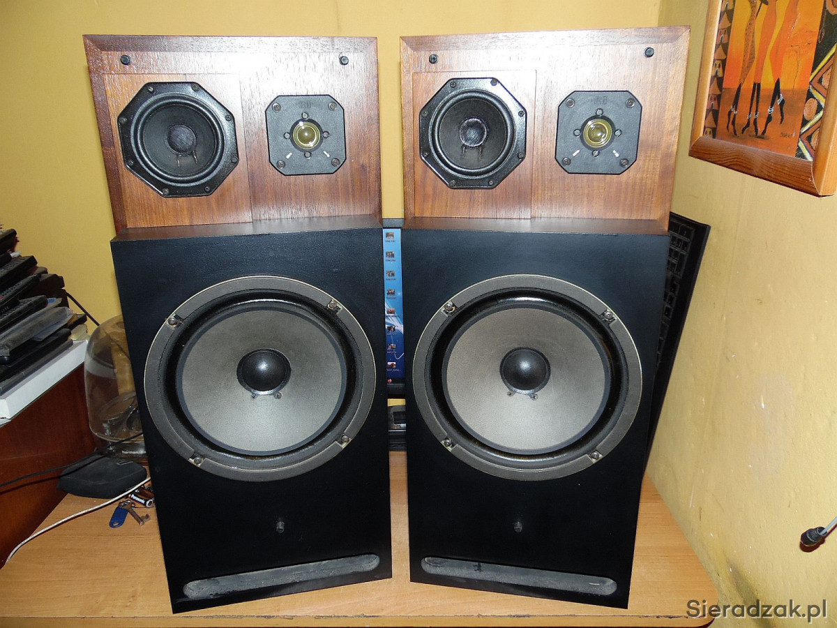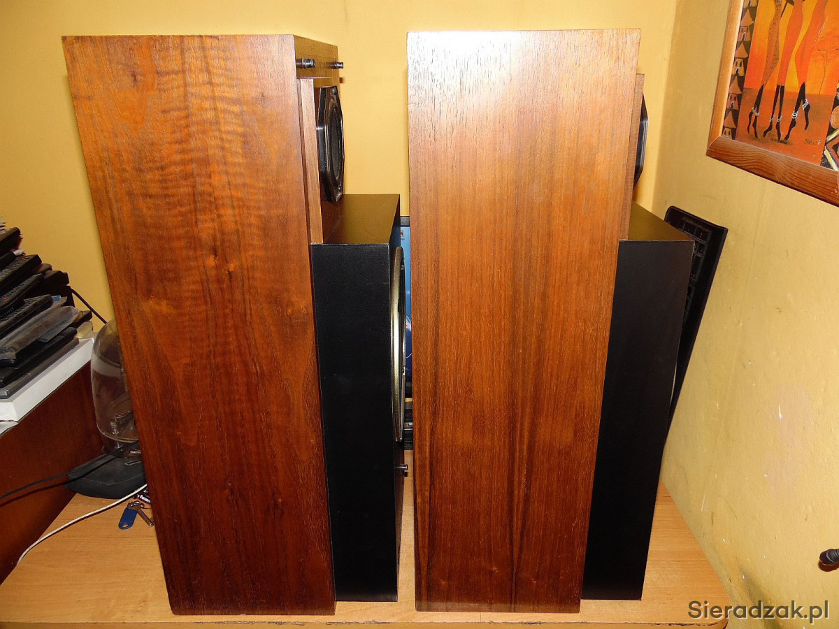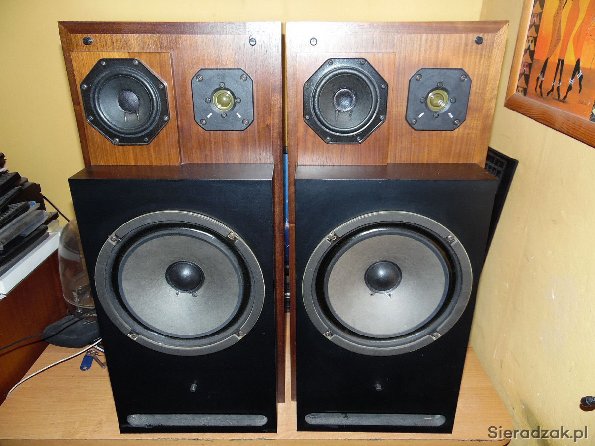 Kolumny w stanie jak na foto Grają rewelacyjnie wysoka skuteczność 92dB idealne do lampy. W jednej kolumnie się wciśnięte kopółki głośników średnio i wysotonowego. Nie ma to wpływu na dźwięk. Maskownice są w komplecie. Wejścia DIN2 starego typu. . Polecam.