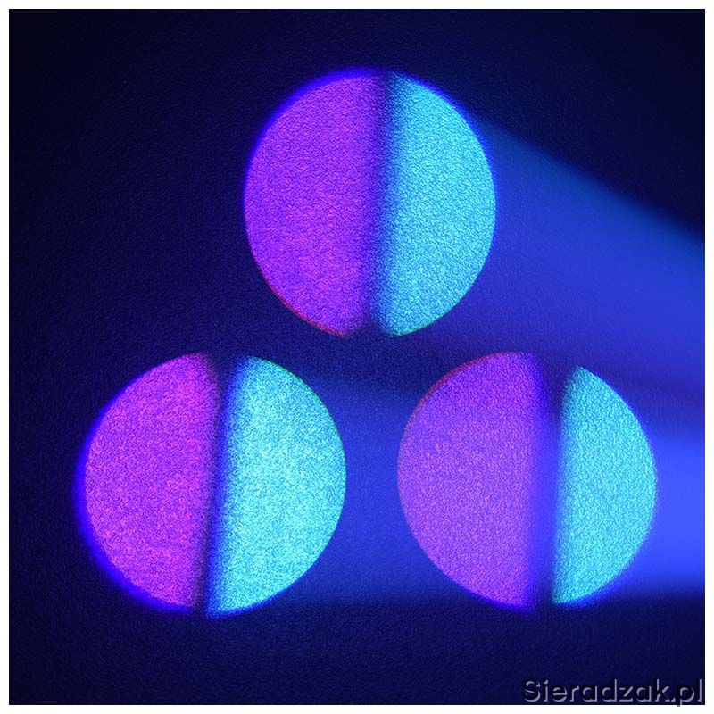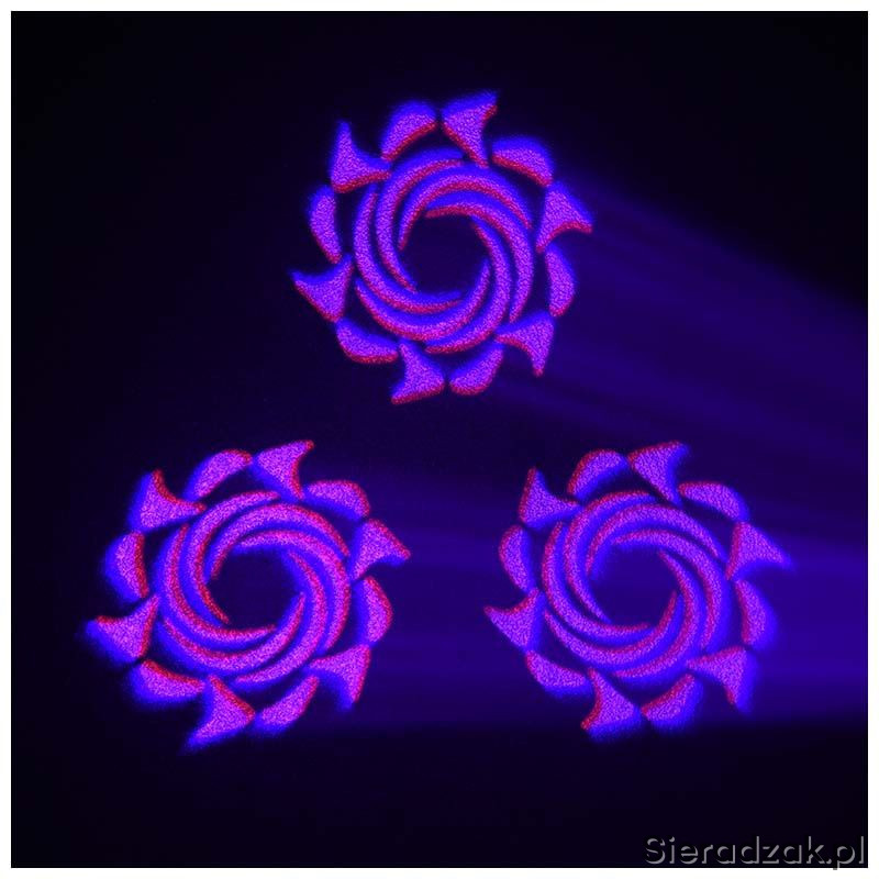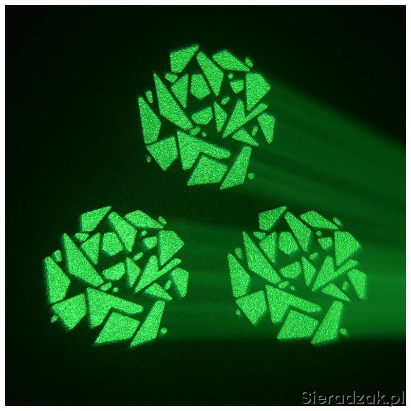 Kompaktowa głowica LED, która doskonale nadaje się do oświetlenia zarówno dużej sceny jak i mniejszych klubów i eventów. Urządzenie oferuje gotowe programy pracy, co znacznie skraca konfigurację w dowolnym typie instalacji. Jest to poręczna i lekka głowica o wysokiej wartości strumienia świetlnego, która może być sterowana w standardzie DMX, Auto, Sound, Master-Slave. Tarcza gobo daje do dyspozycji 7 nowoczesnych wzorów kształtujących strumień światła. Dużym atutem jest również pryzmat, który rozszczepia wiązki na 3 części. Idealną ostrość zapewnia manualny zoom, który pozwala na precyzyjne wyostrzenie krawędzi plamy świetlnej.