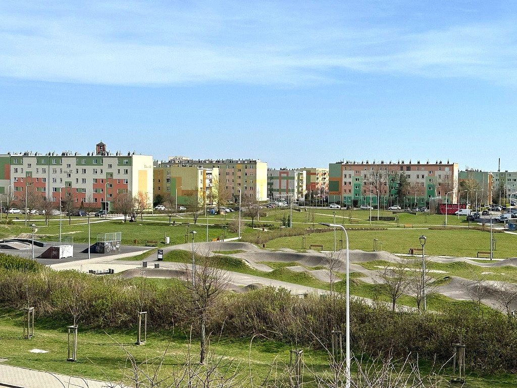 Pod budynkiem liczne miejsca parkingowe oraz skatepark.