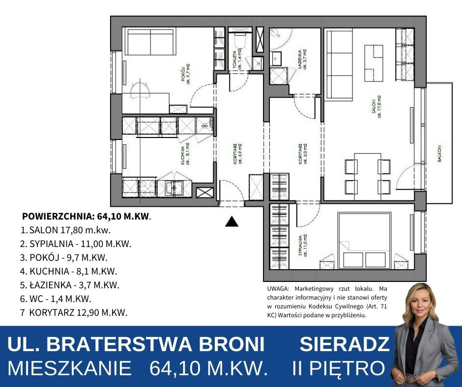 DO SPRZEDANIA MIESZKANIE TRZYPOKOJOWE O POWIERZCHNI 64,10 MKW POŁOŻONE NA DRUGIM PIĘTRZE W BLOKU PRZY UL. BRATERSTWA BRONI 3 W SIERADZU.