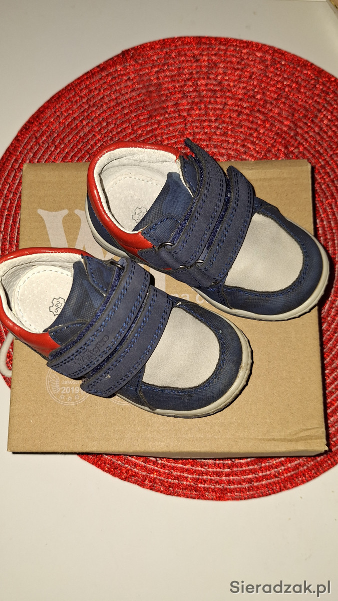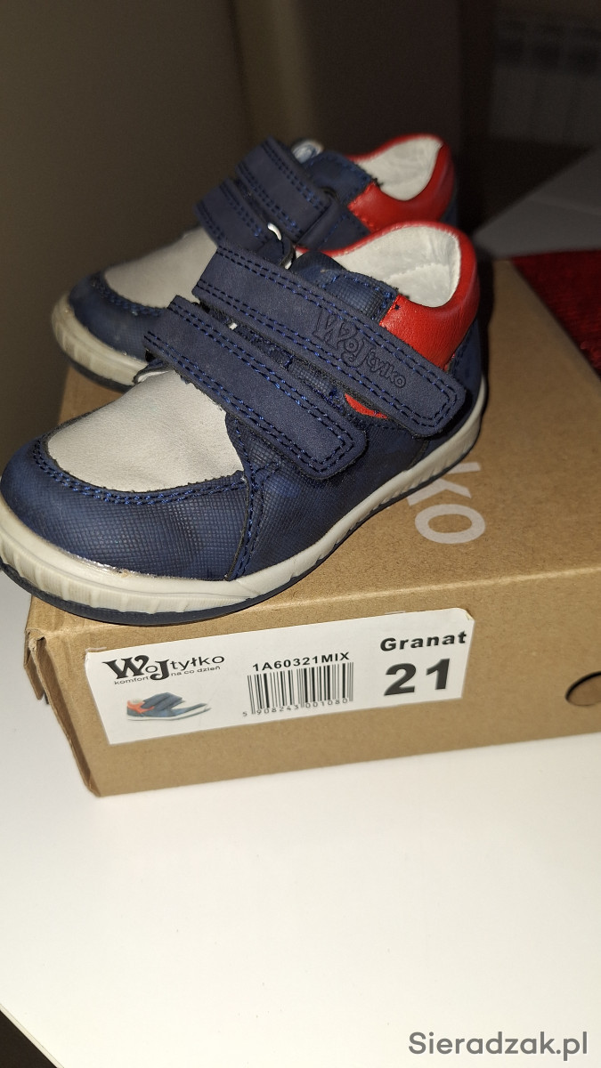 Półbuty dziecięce. Wnętrze buta (podszewka, wkładka) - skóra naturalna. Miękka, skórzana, częściowo perforowana wkładka. Zapięcie na dwa rzepy. Usztywnione zapiętki. Elastyczna, antypoślizgowa podeszwa.Rozmiar 21. Stan bardzo dobry.Niezniszczone po jednym dziecku.Polecam 511 136 443
