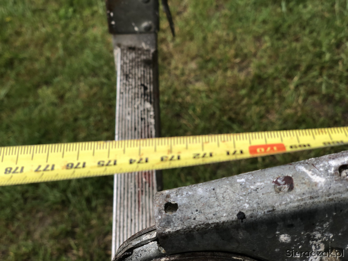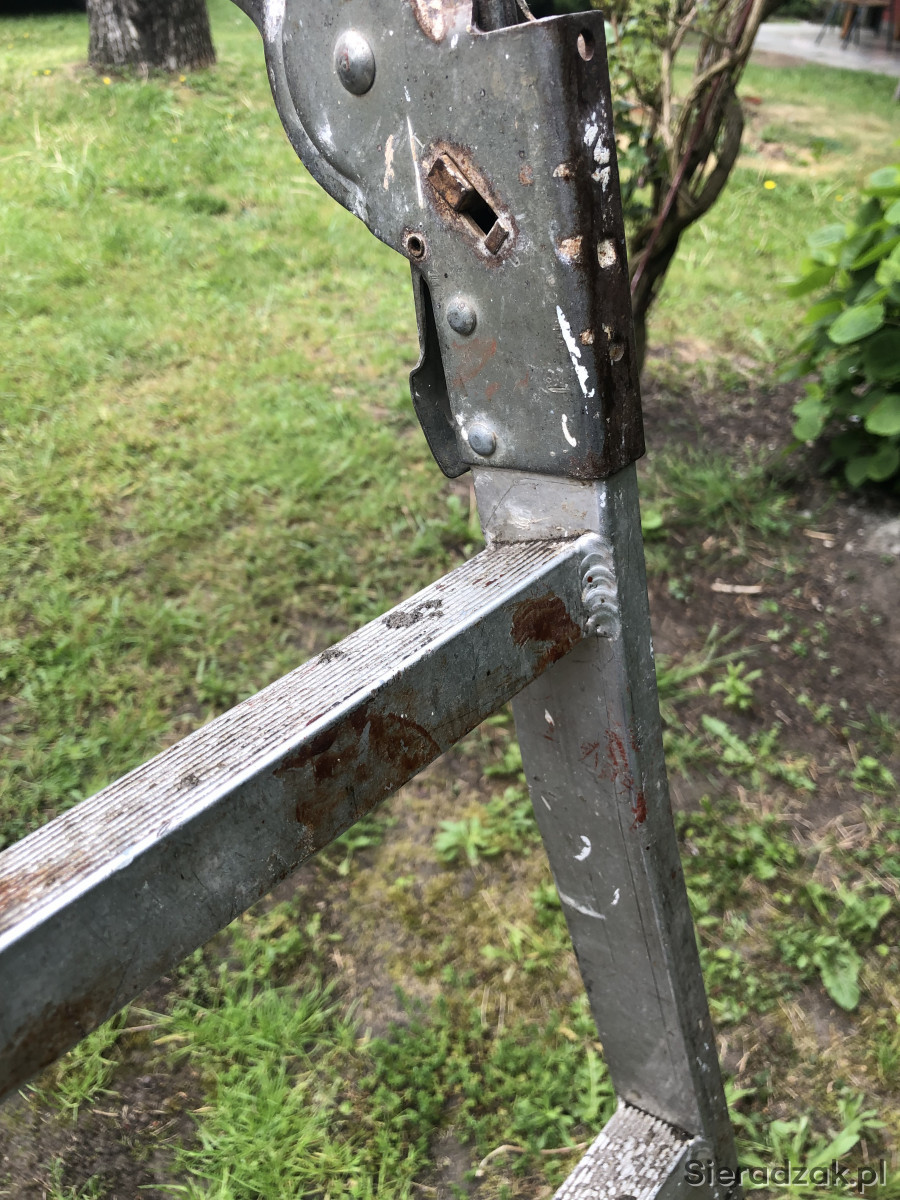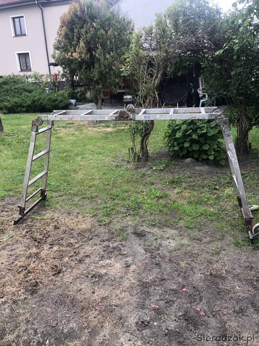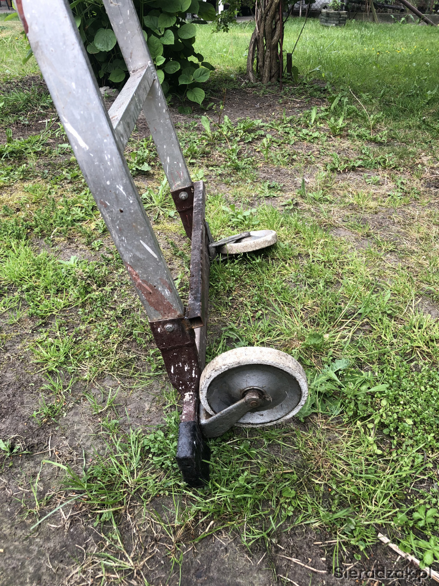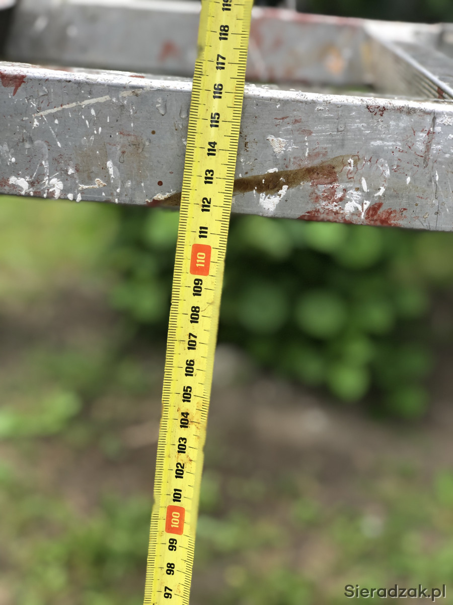 Drabina ,pomost aluminiowa spawana z jednej strony zamontowane kółka. Wysokość 115 długość pomostu 175 cm. Po wyprostowaniu ok 4 m nie uszkodzona odbiór odobisty.