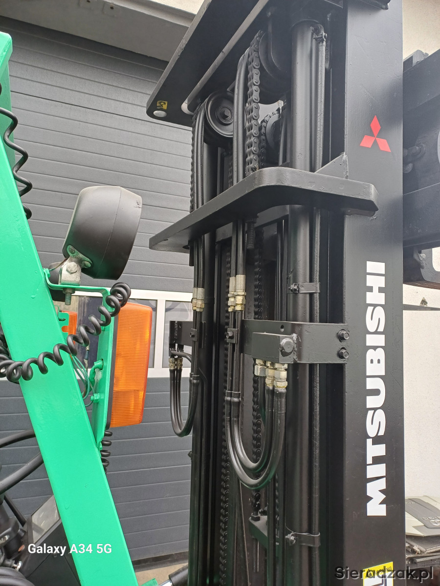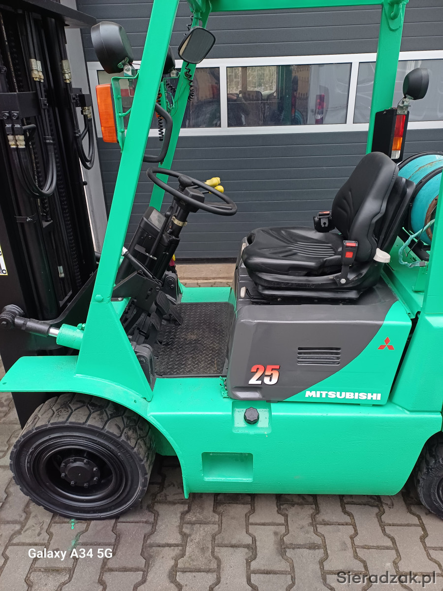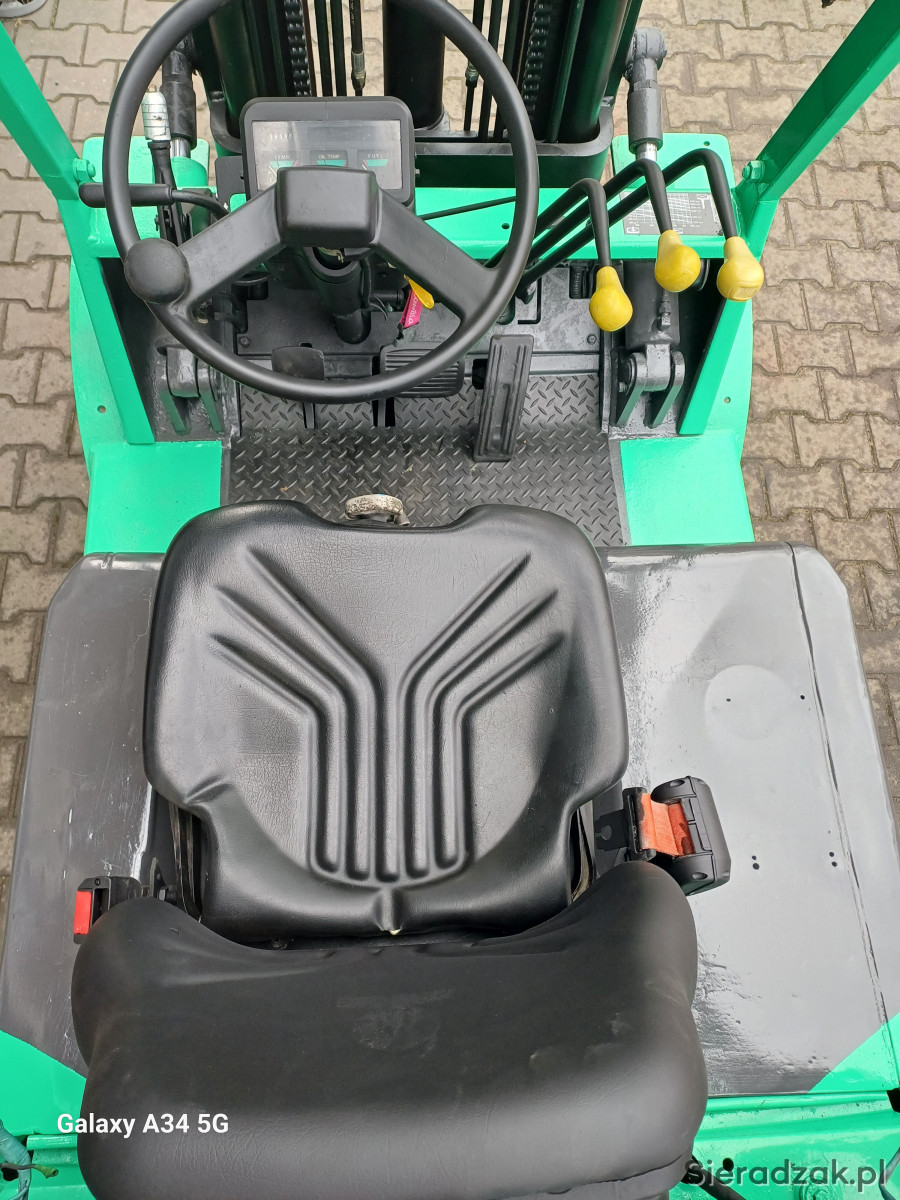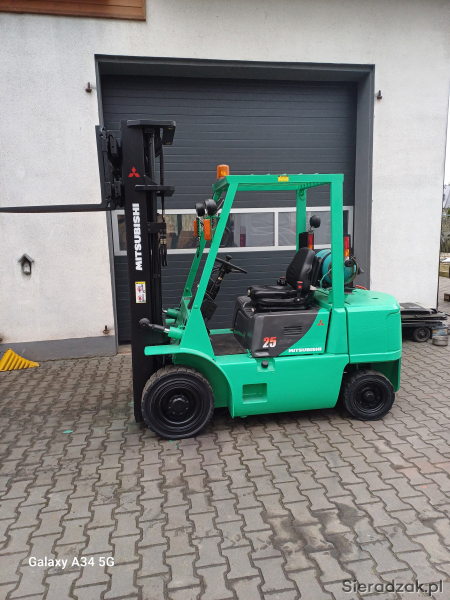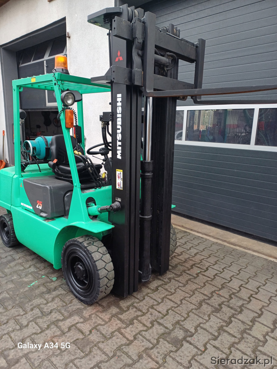 Sprzedam wózek widłowy widlak Mitsubishi fg25 udźwig 2.5 tony posiada maszt triplex wolny skok i przesów boczny wideł opony pelne skrzynia biegów automatyczna pelne oświetlenie sygnalizator dzwiekowy cofania oswietlenie ostrzegawcze kogut klakson maszt bardzo sztywny nie wyrobiony