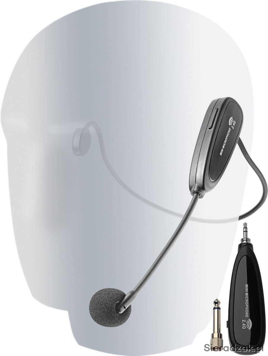 Zestaw bezprzewodowy nagłowny nadajnik i odbiornik do podłączenia z głośnikiem kolumną aktywną, mikserem audio wzmacniaczem.