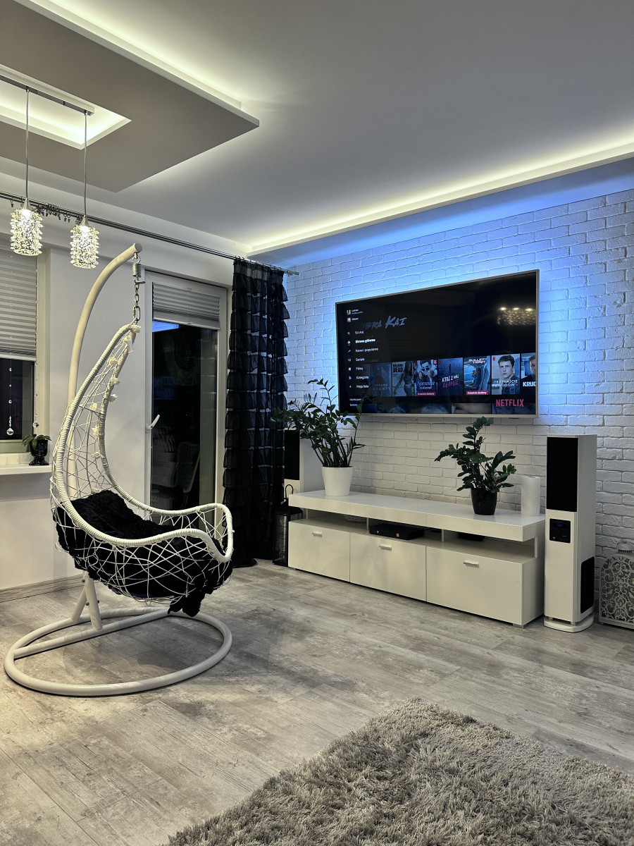 Salon (pokój I) - widne pomieszczenie z wyjściem na przestronny balkon typu loggia, wielkie okno panoramiczne o wymiarach 130x195 cm z nowoczesną roletą, na podłodze panele, ściany w tynku ozdobnym, jedna ze ścian w dekoracyjnej białej cegłę, podwieszony sufit wraz z oświetleniem LED oraz dodatkowym oświetleniem, wymienione drzwi wewnętrzne;