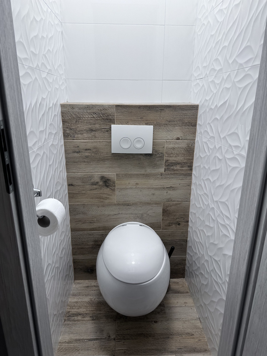 Osobne WC wyposażone w wymieniony zestaw podtynkowy, aranżacja wykonana według projektu na podobieństwo łazienki, położone płytki i gładź, zamontowany plafon;