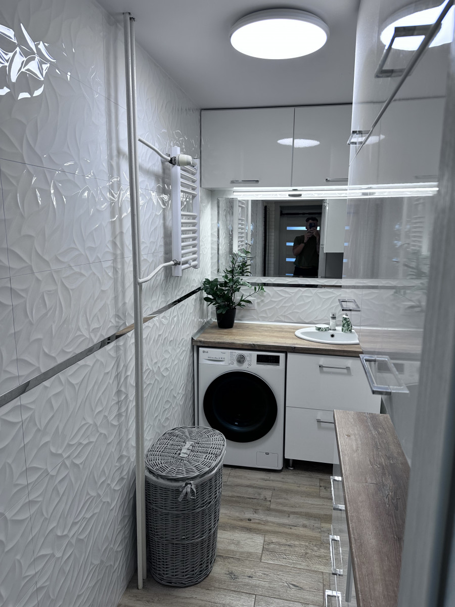 Łazienka – wymieniona wanna ze szklanym parawanem i możliwością natrysku, meble na wymiar, umywalka z szafką oraz zlewem, wymieniony grzejnik, położone gładzie oraz płytki podłogowe, plafon oraz oświetlenie LED nad lustrem;