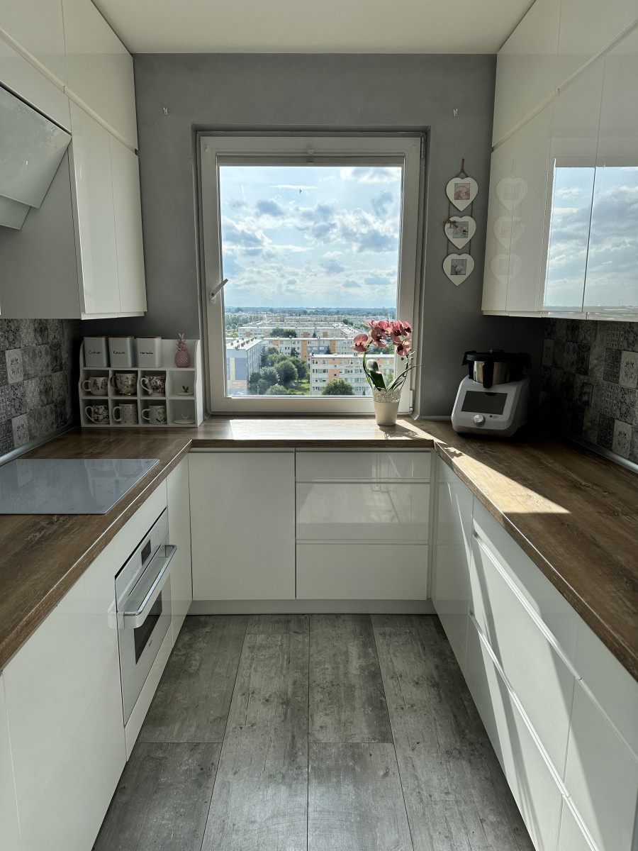 Kuchnia - z oknem wyposażonym w roletę, meble na wymiar, położone nowe płytki, zamontowany plafon.