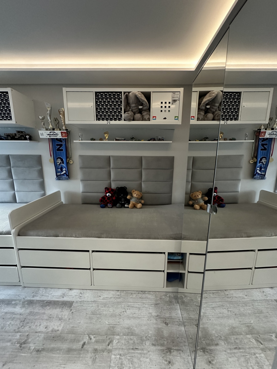Pokój IV - ściany w gładzi, na podłodze panele, podwieszony sufit, przesuwne drzwi;