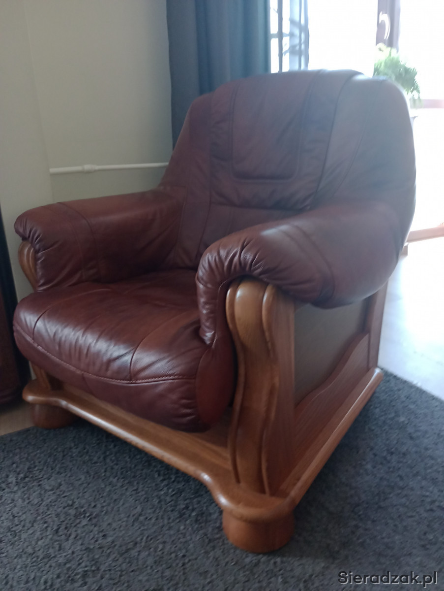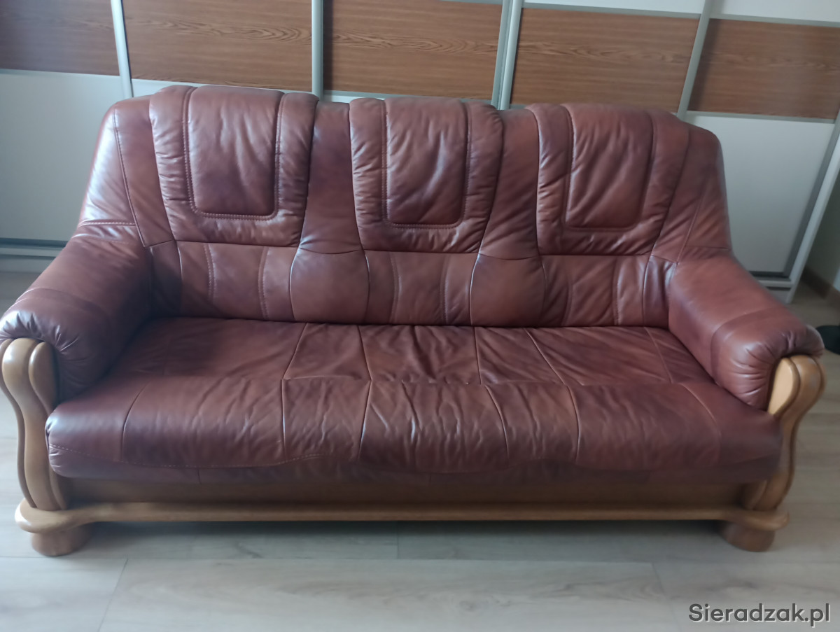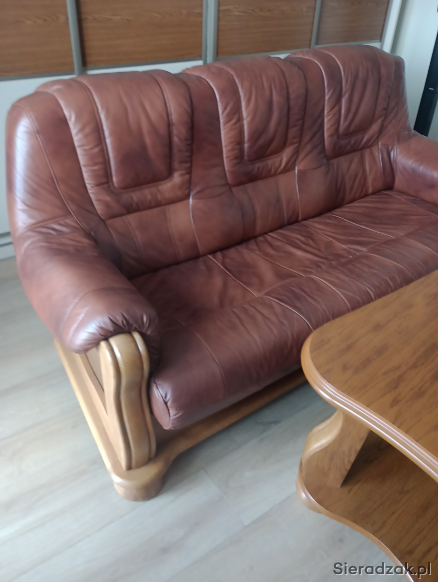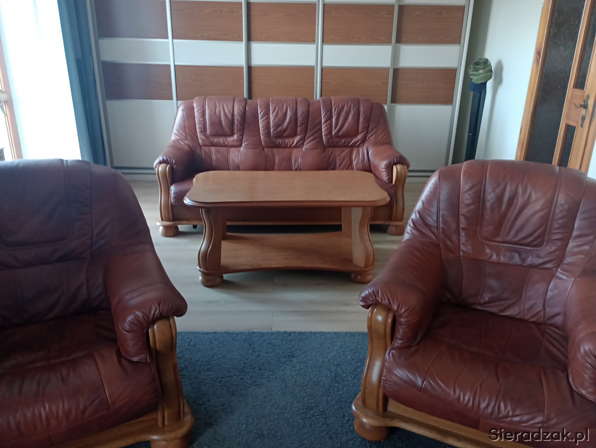 Sprzedam komplet wypoczynkowy skórzany. 1 x sofa z funkcją spania. 2 szt x fotel. 1x ława. Wypoczynek mało używany. Stan skóry idealny. Z tyłu sofy lekko pęknięta płyta ( widoczne na zdjęciu). Ogólny stan bardzo dobry.