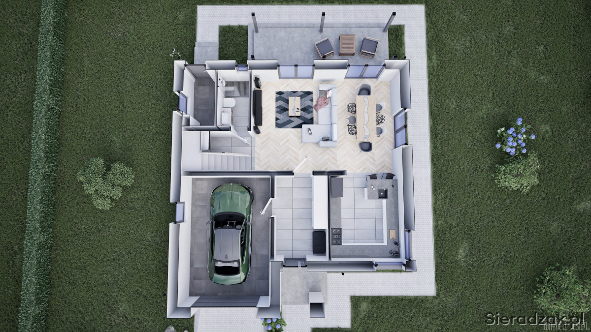 PARTER: przestrony salon z wyjściem na taras oraz otwartą kuchnią, łazienka, przedpokój, garaż oraz kotłownia