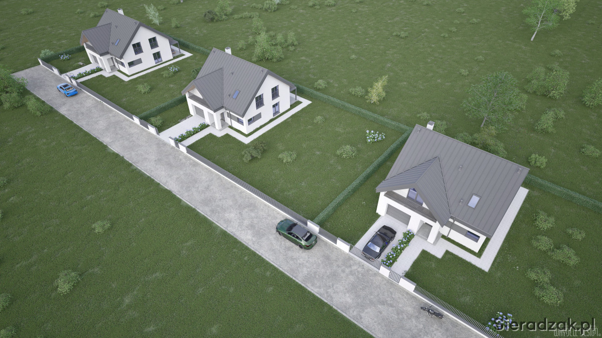 Domy posadowione zostaną na trzech odrębnych działkach o powierzchni 823 m2, 822 m2 oraz 824 m2. Działki mają bezpośredni dostęp do drogi gminnej oraz urządzonej drogi wewnętrznej.