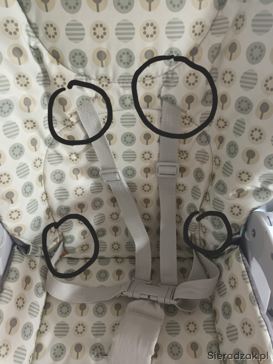Krzesełko w dobrym stanie (na tapicerce są lekkie rozdarcia zaznaczone na zdjęciu oraz na tacce jest biała kropka jednak w żaden sposób nie przeszkadza to w normalnym funkcjonowaniu). Kolor szary jest malo brudzący, pasuje zarówno dla dziewczynki jak i chłopca.
