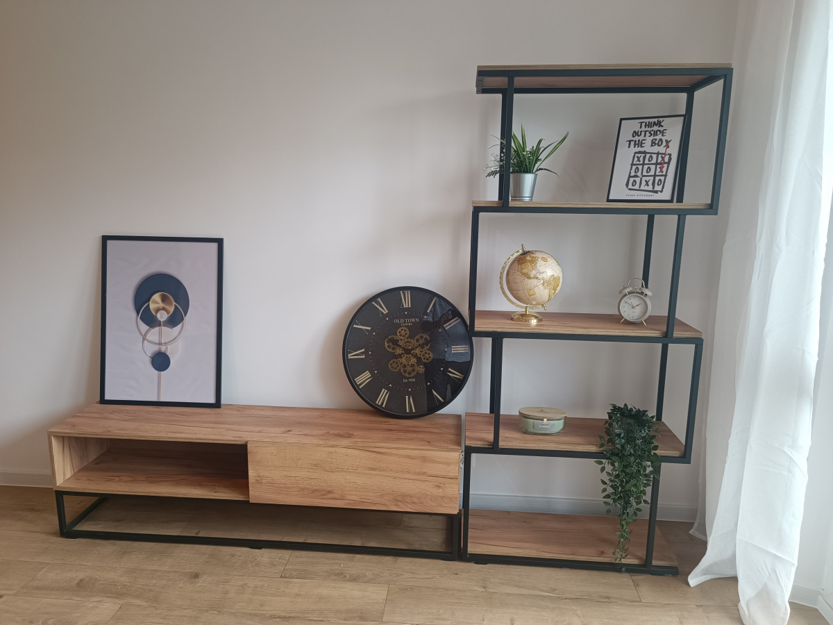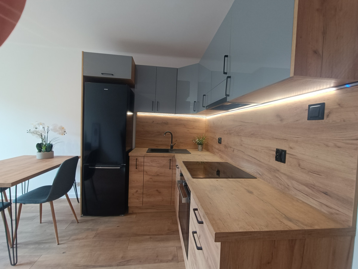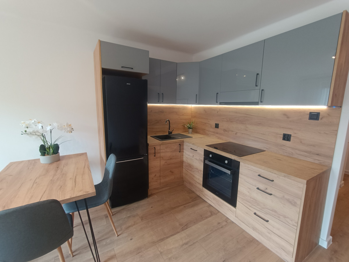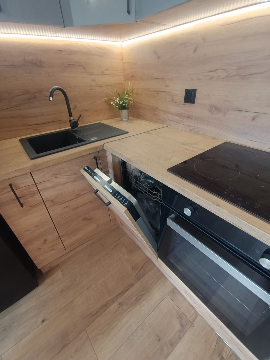 Kuchnia: Indywidualnie zaprojektowana i wykonana przez stolarza, w pełni wyposażona w nowy sprzęt agd (lodówka, płyta indukcyjna, piekarnik, zmywarka, nowoczesny okap oraz oświetlenie led). Połączenie szarego lakieru i płyty dębowej daje niesamowity efekt jakiego niestety nie oddają zdjęcia.