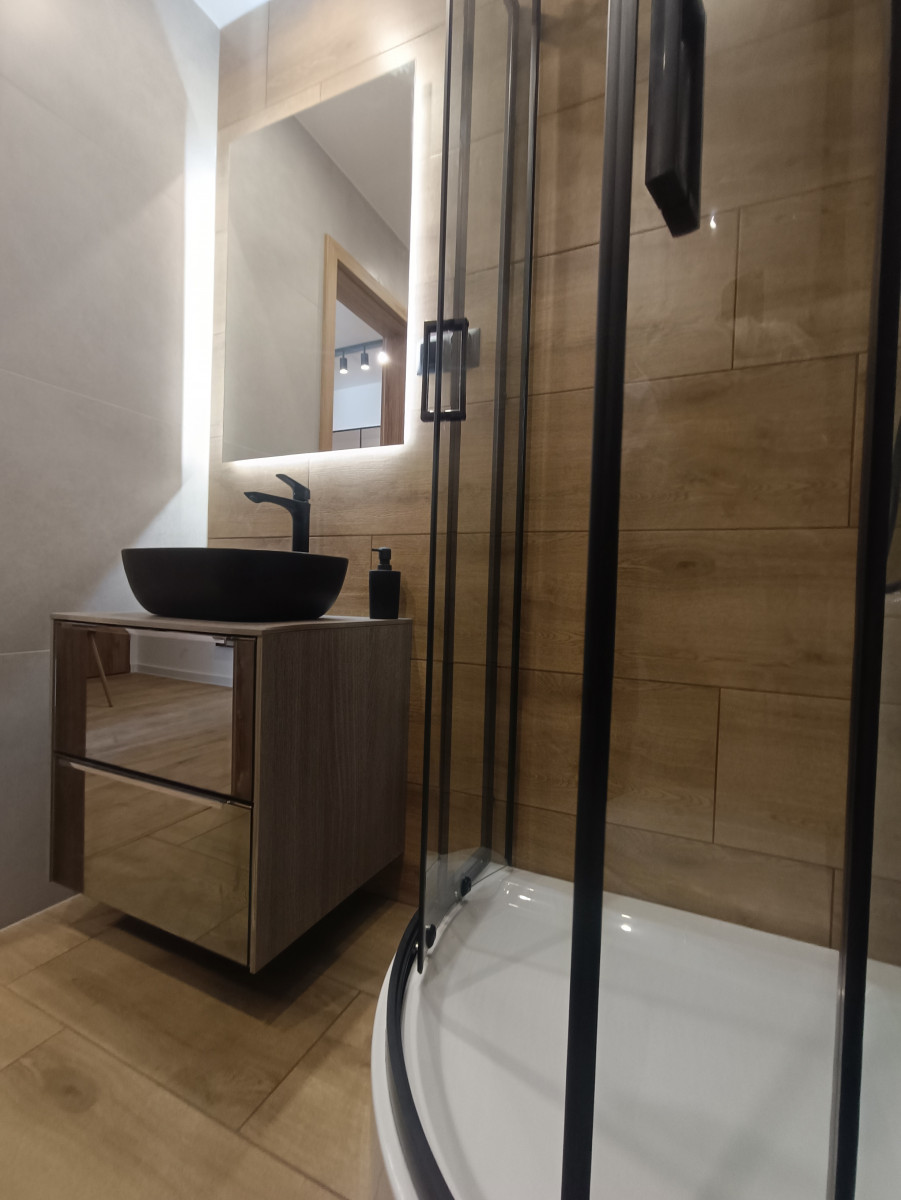Łazienka: Elegancka łazienka z hiszpańskimi płytkami, lustrem led, prysznicem, zapewniająca komfort i relaksującą atmosferę.
